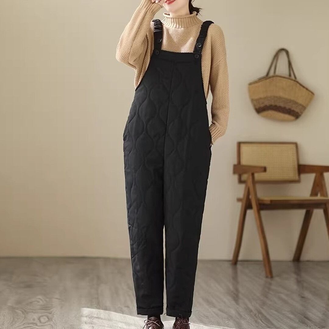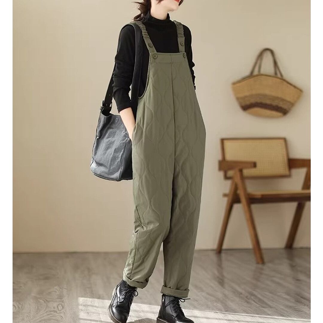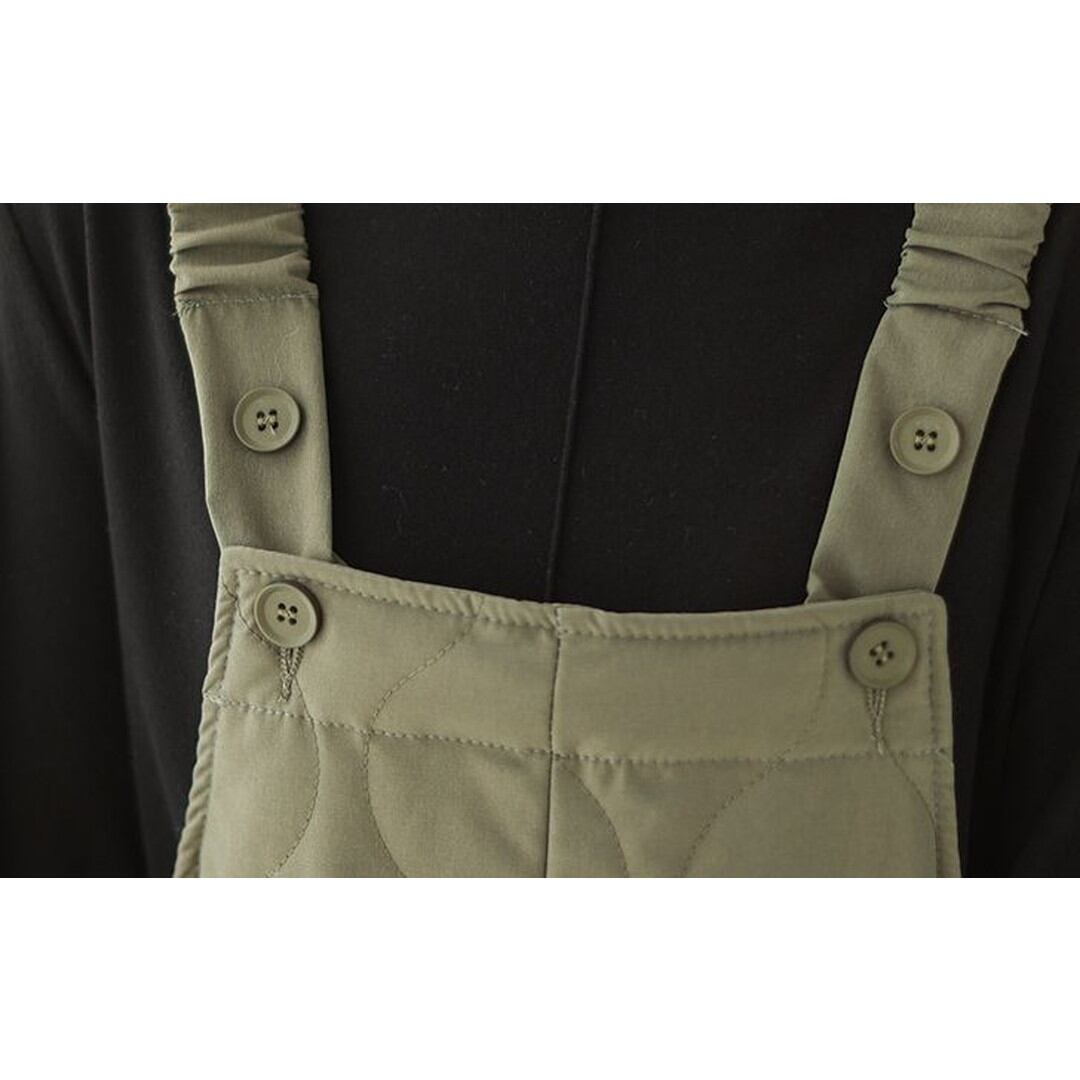 キルティング加工が施されたフルレングスのサスペンダー付きオーバーオール。シンプルなデザインで、様々なトップスと合わせやすく、普段使いに最適です。サスペンダーは調整可能で、お好みの長さに合わせて着用いただけます。ゆったりとしたシルエットで動きやすく、快適な着心地です。