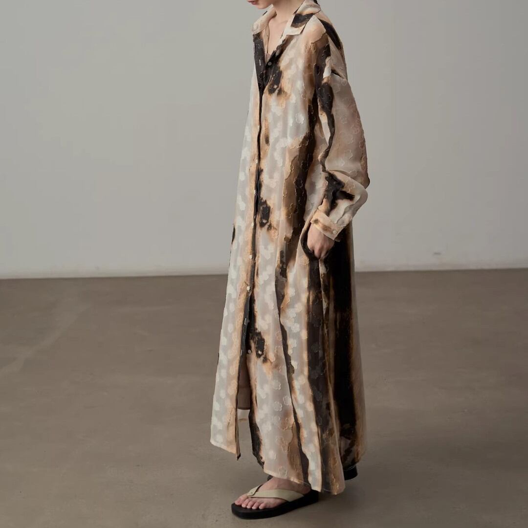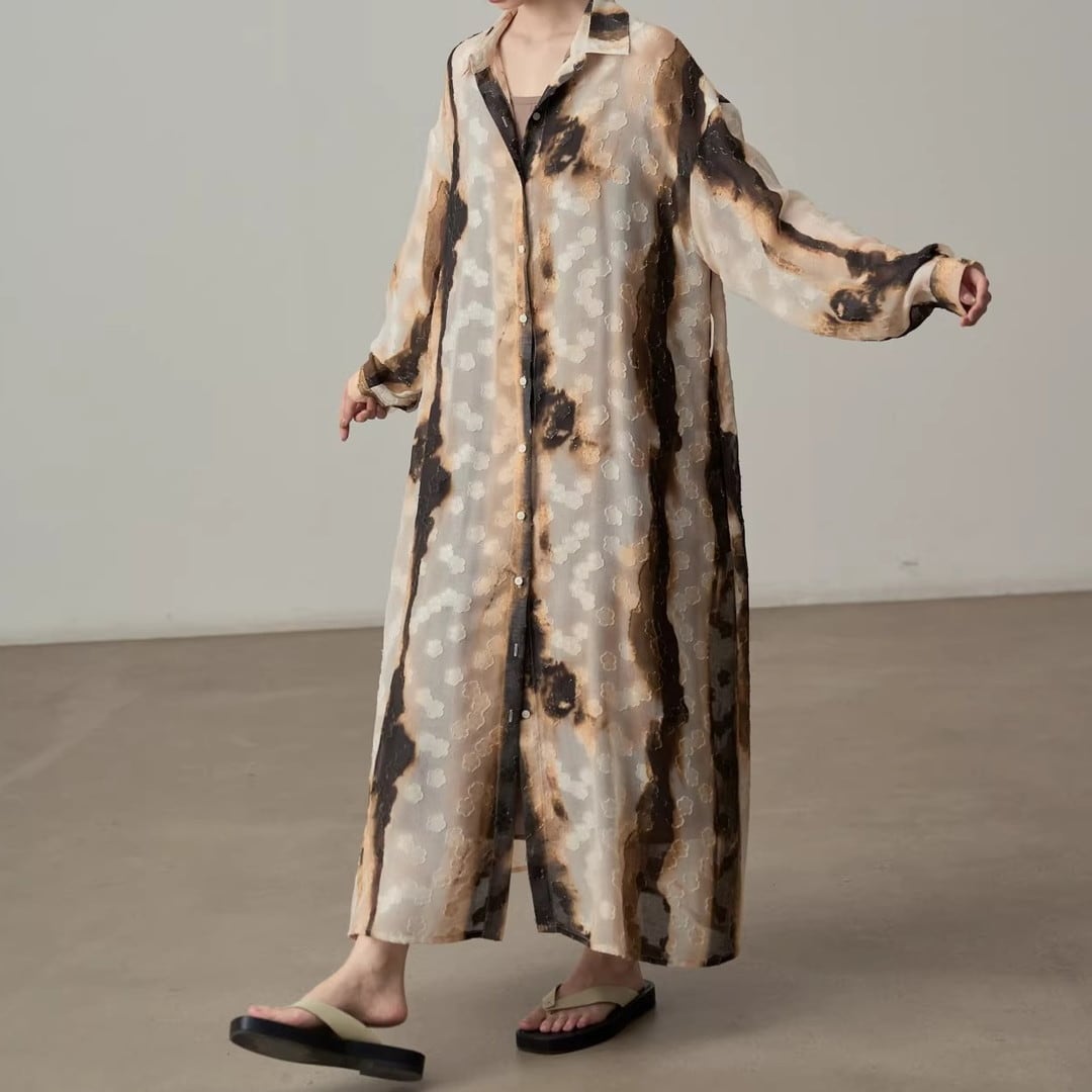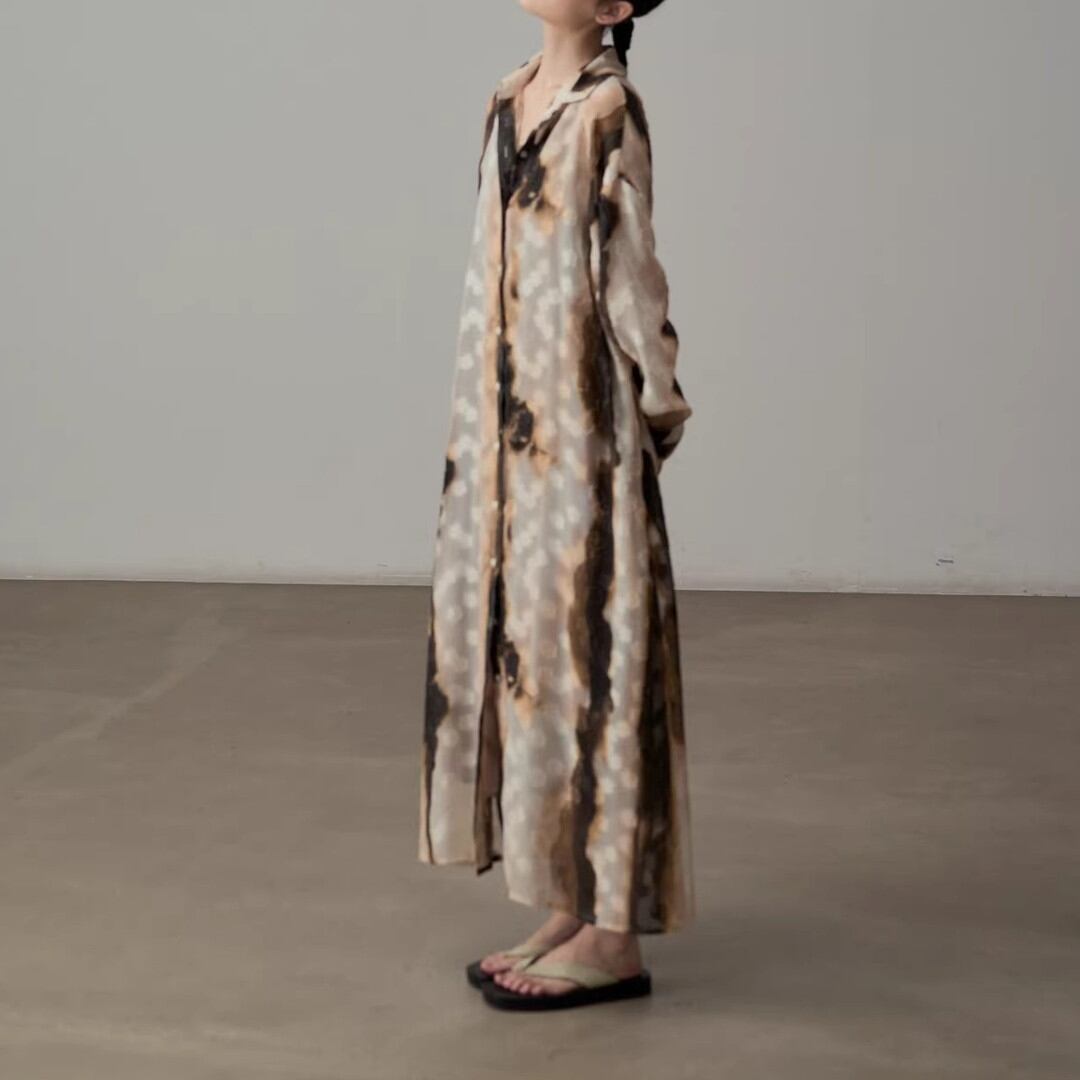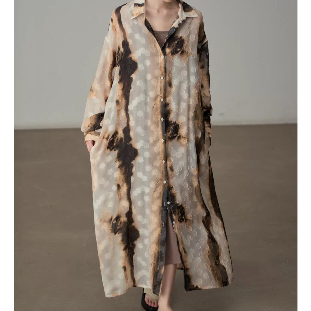 上品な柄が目を引くマキシ丈のシャツワンピース。