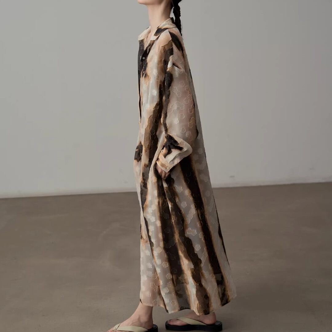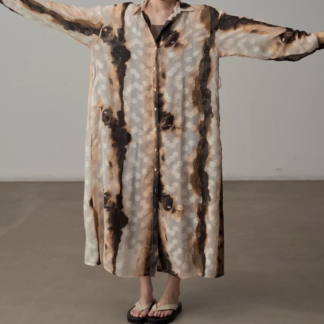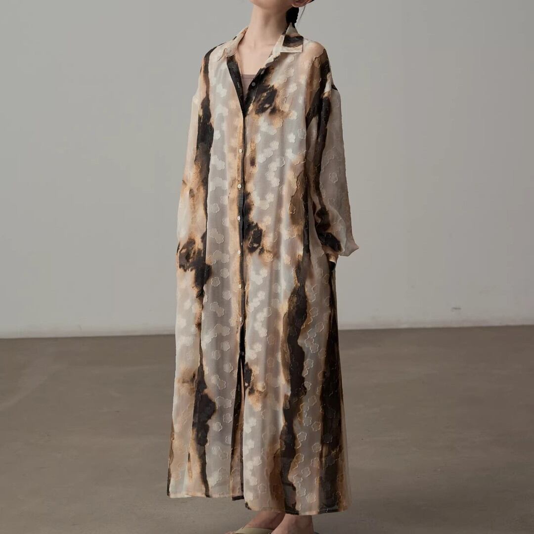 上品な柄が目を引くマキシ丈のシャツワンピース。