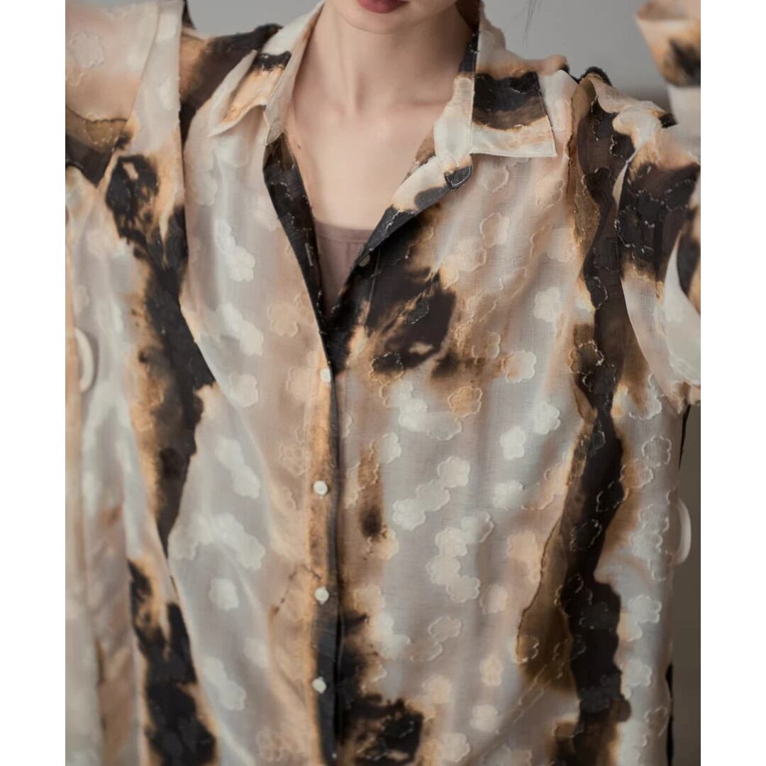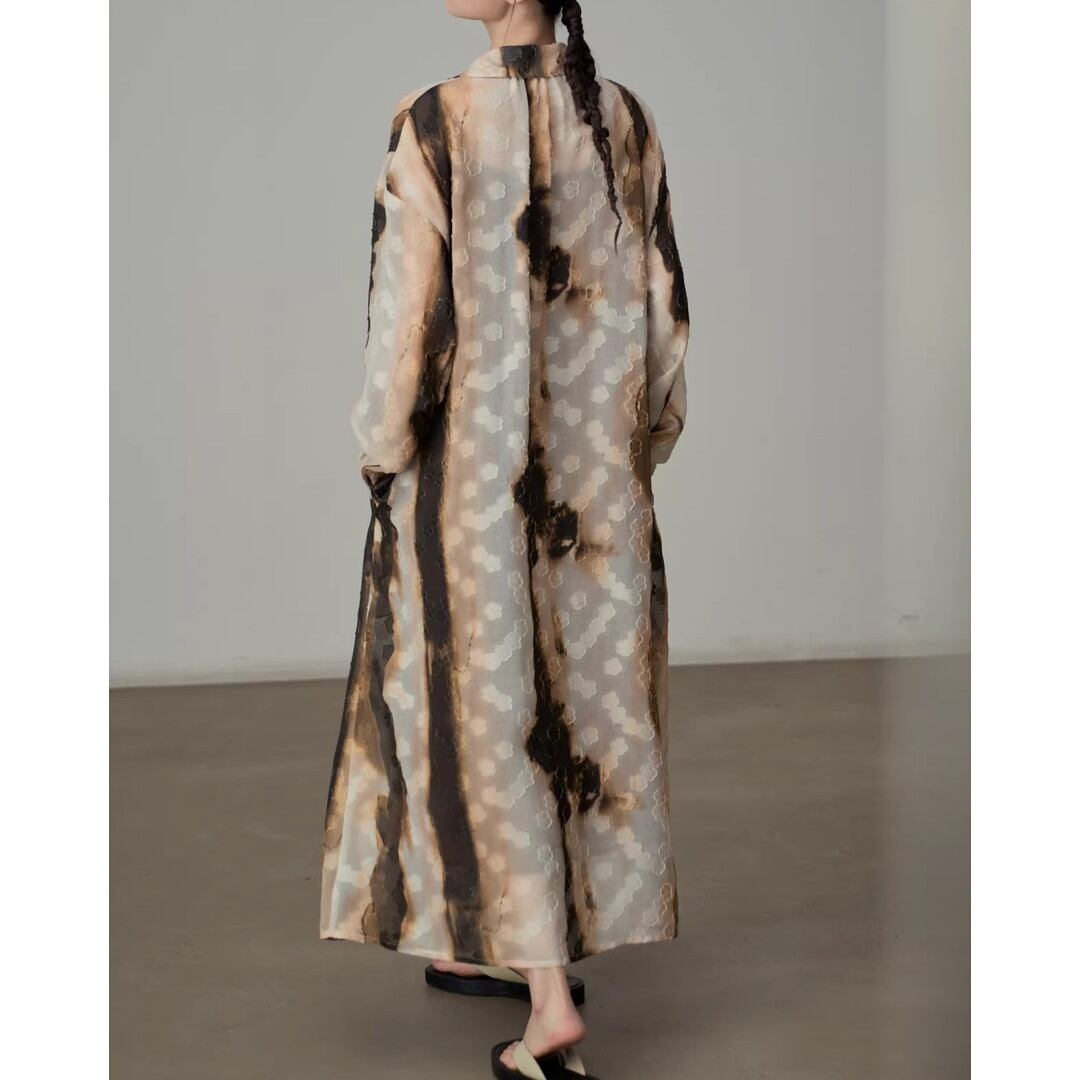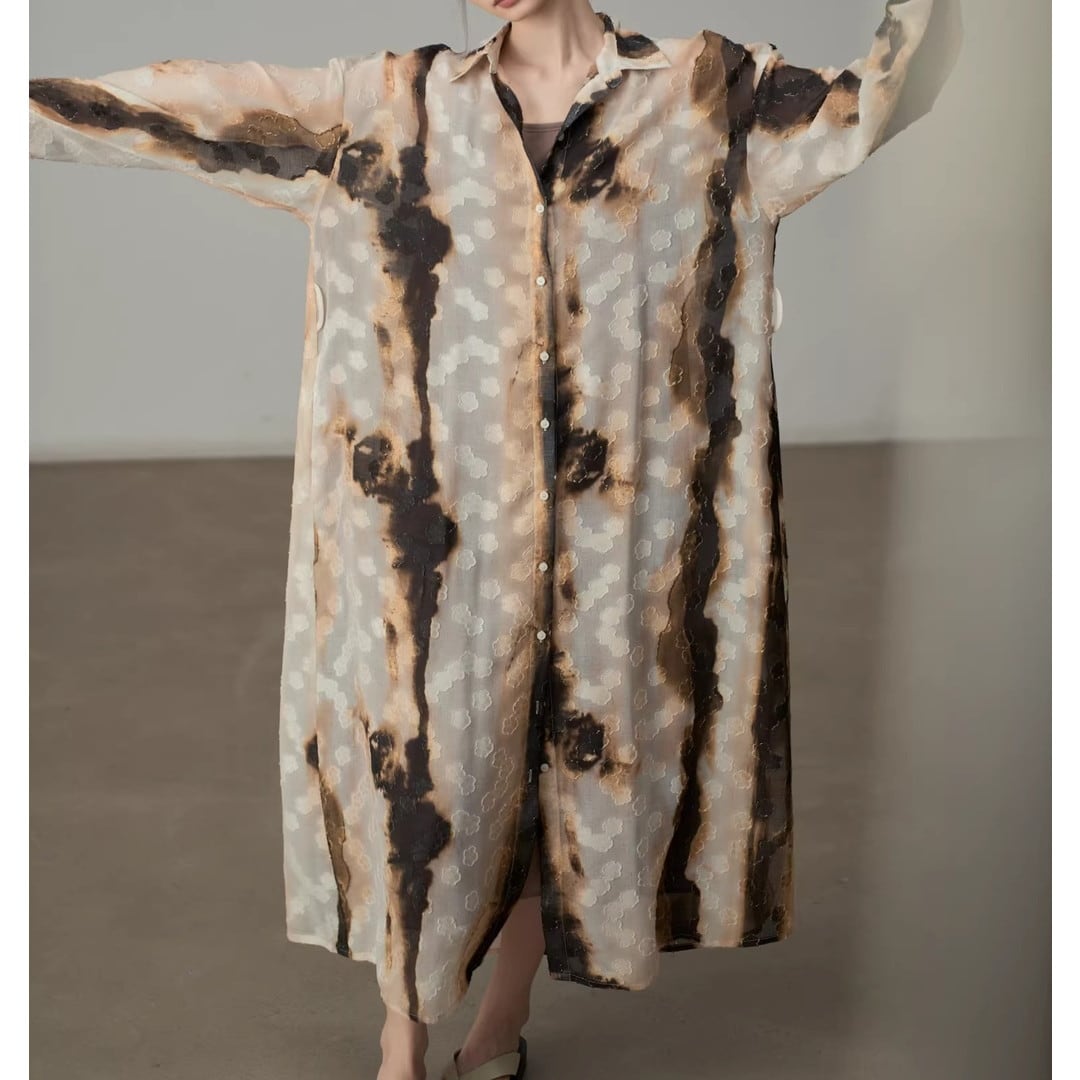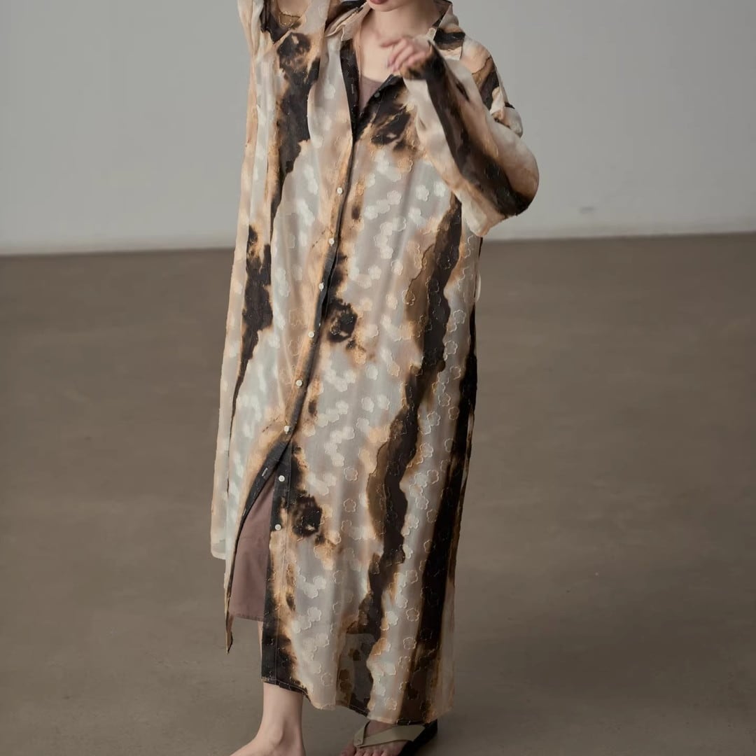 上品な柄が目を引くマキシ丈のシャツワンピース。