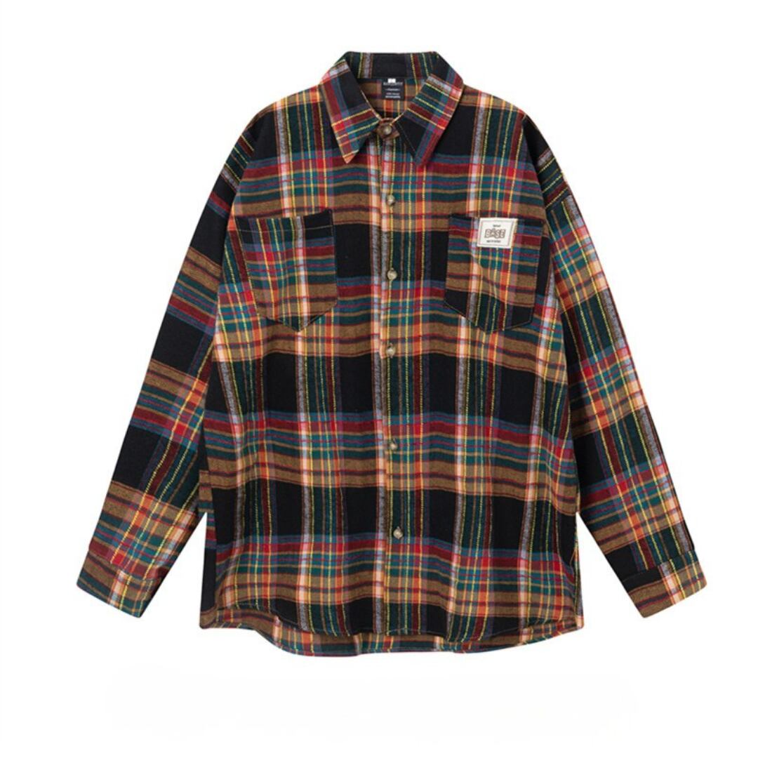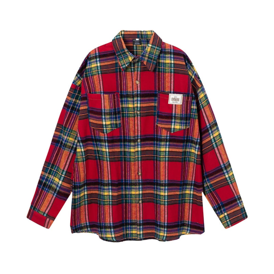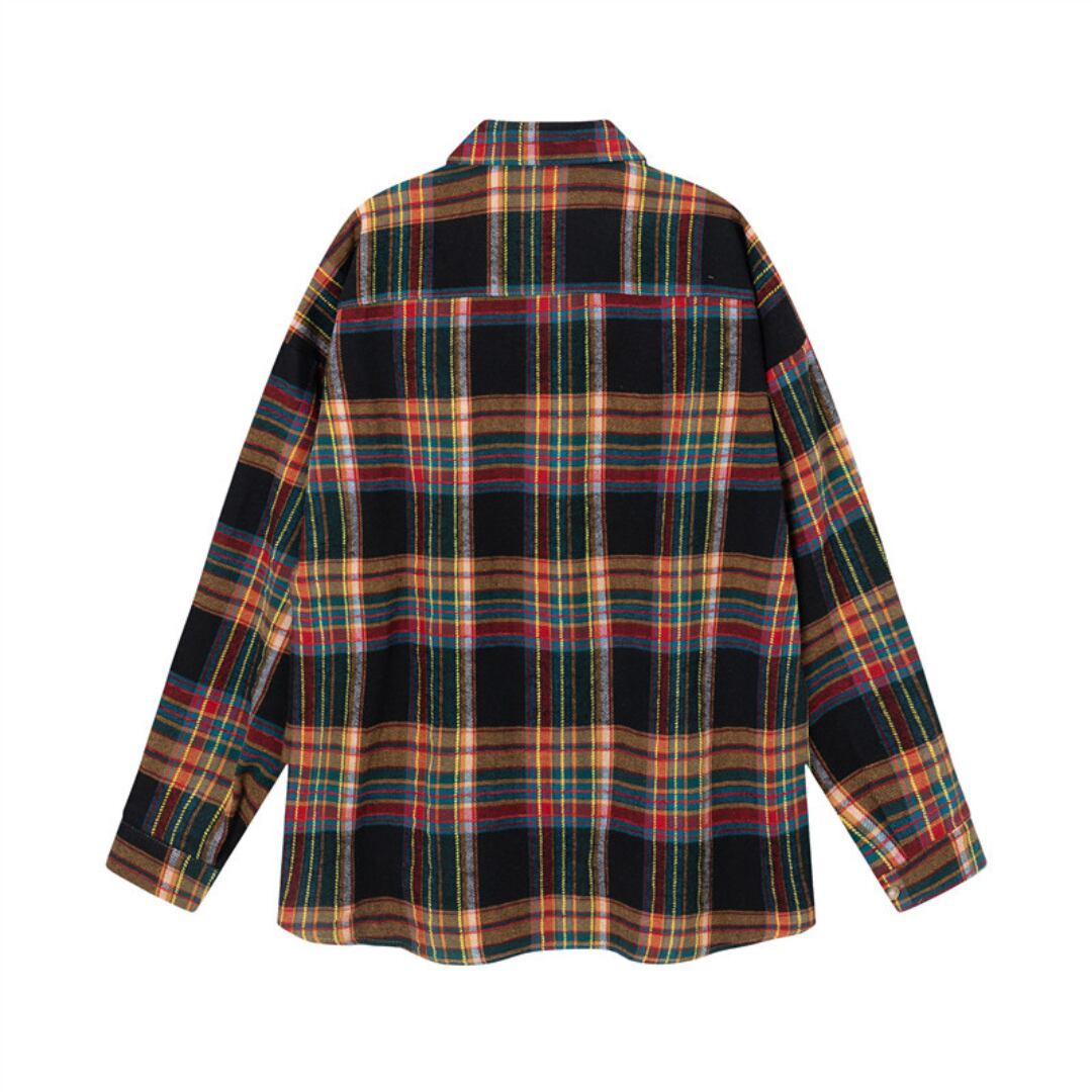 目を引くチェック柄が特徴的な長袖シャツ。