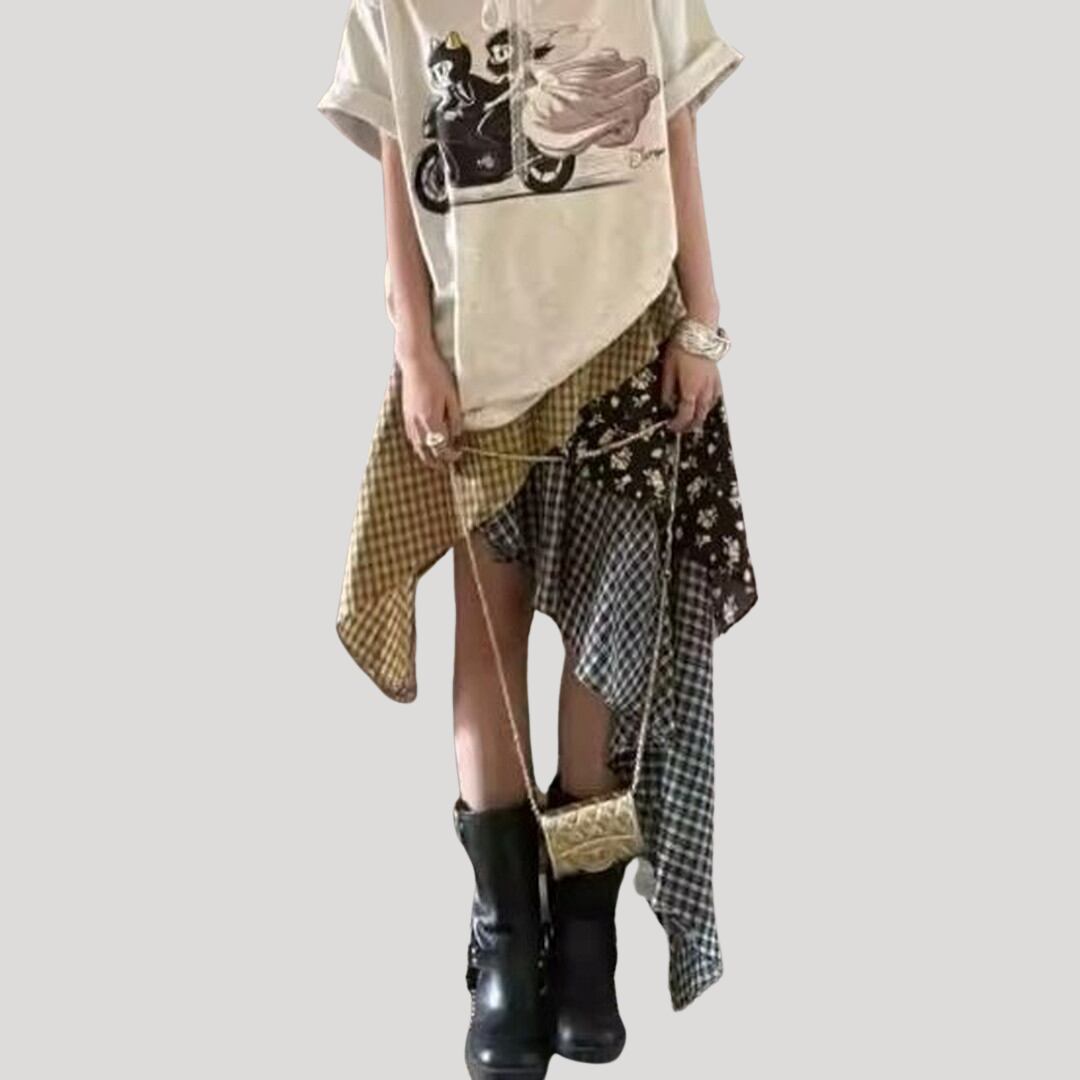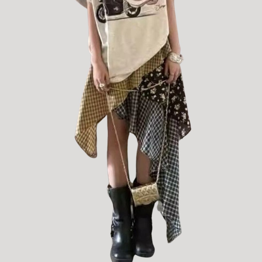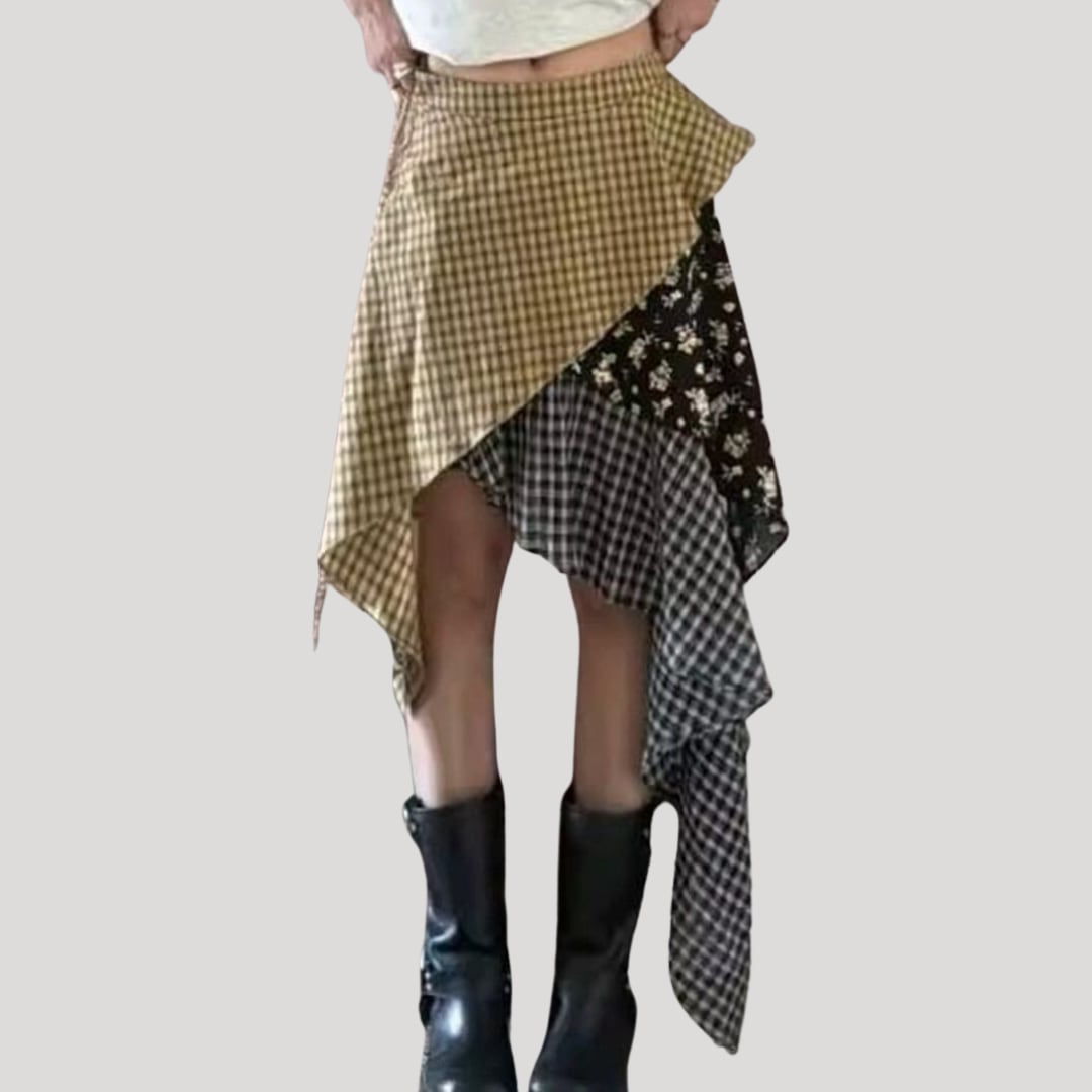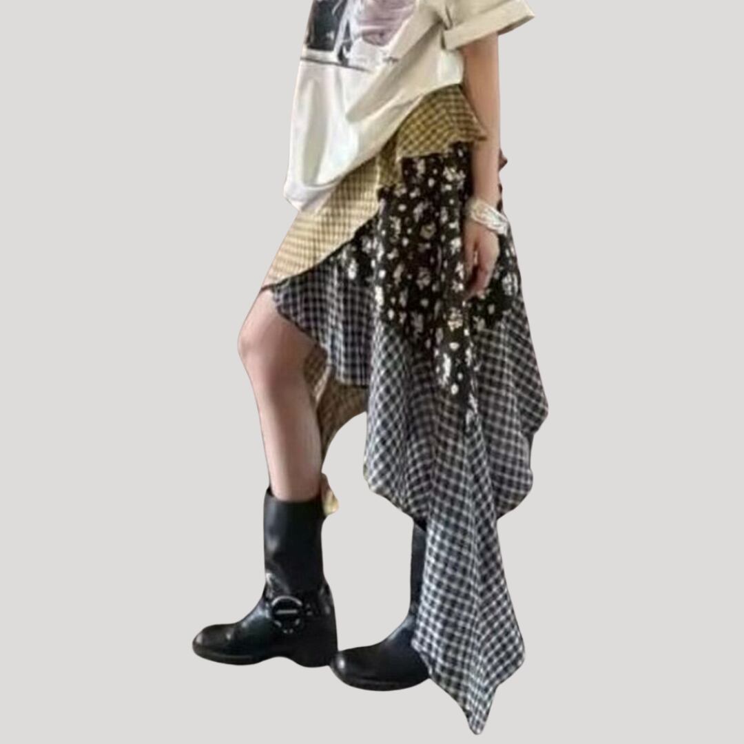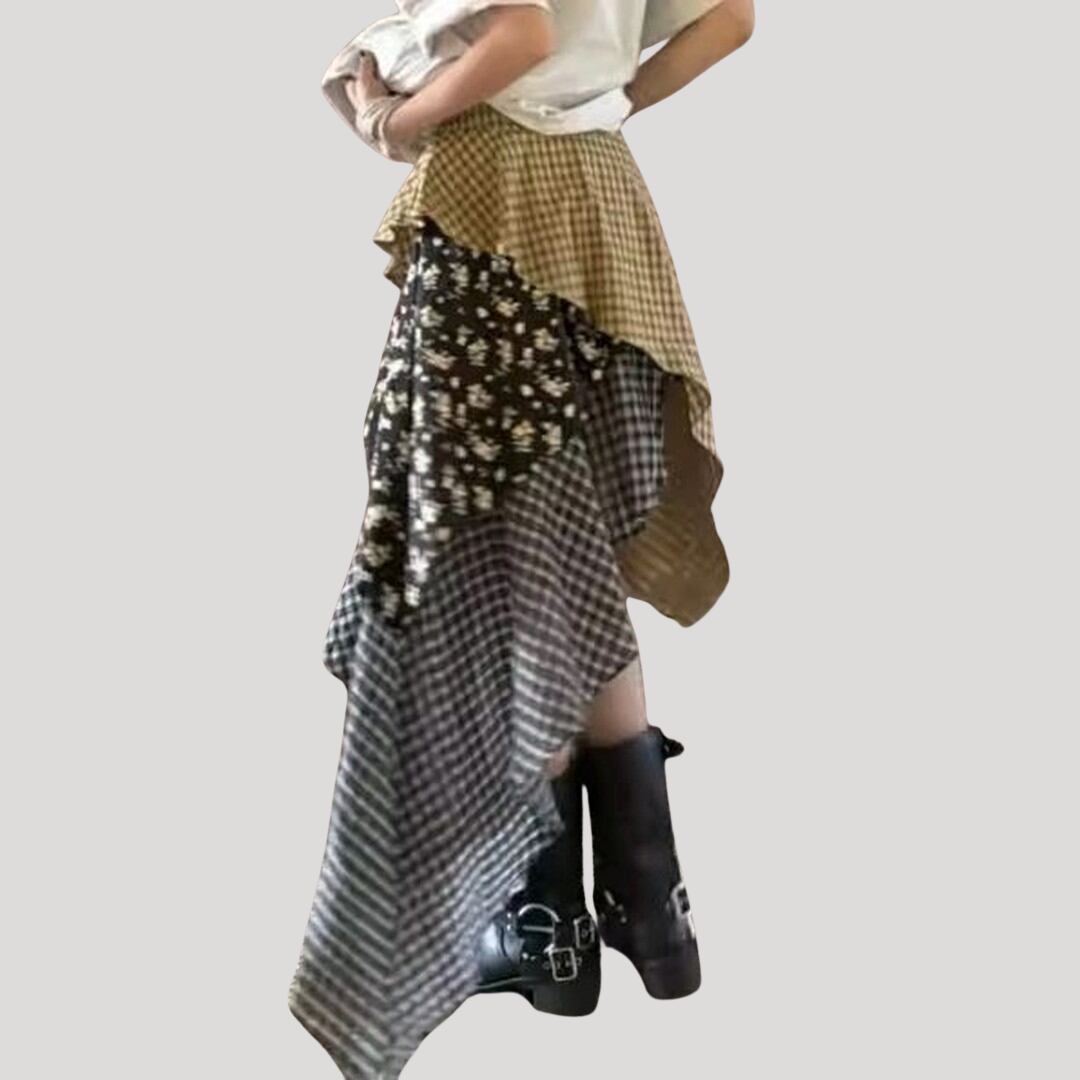 アシンメトリーミディ丈パッチワーク風スカート【001851】