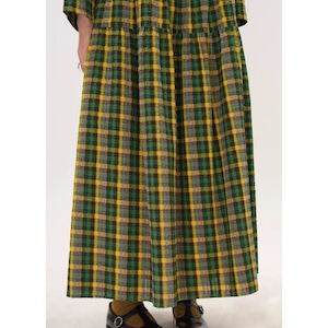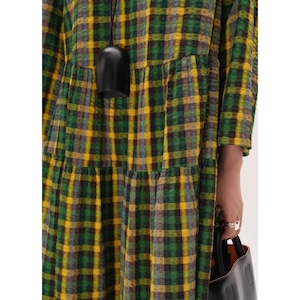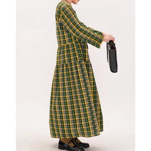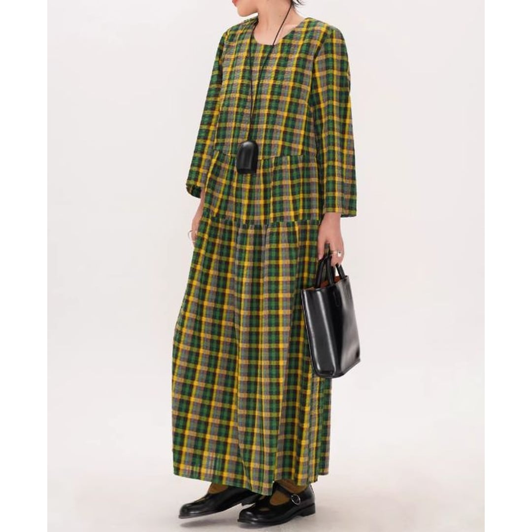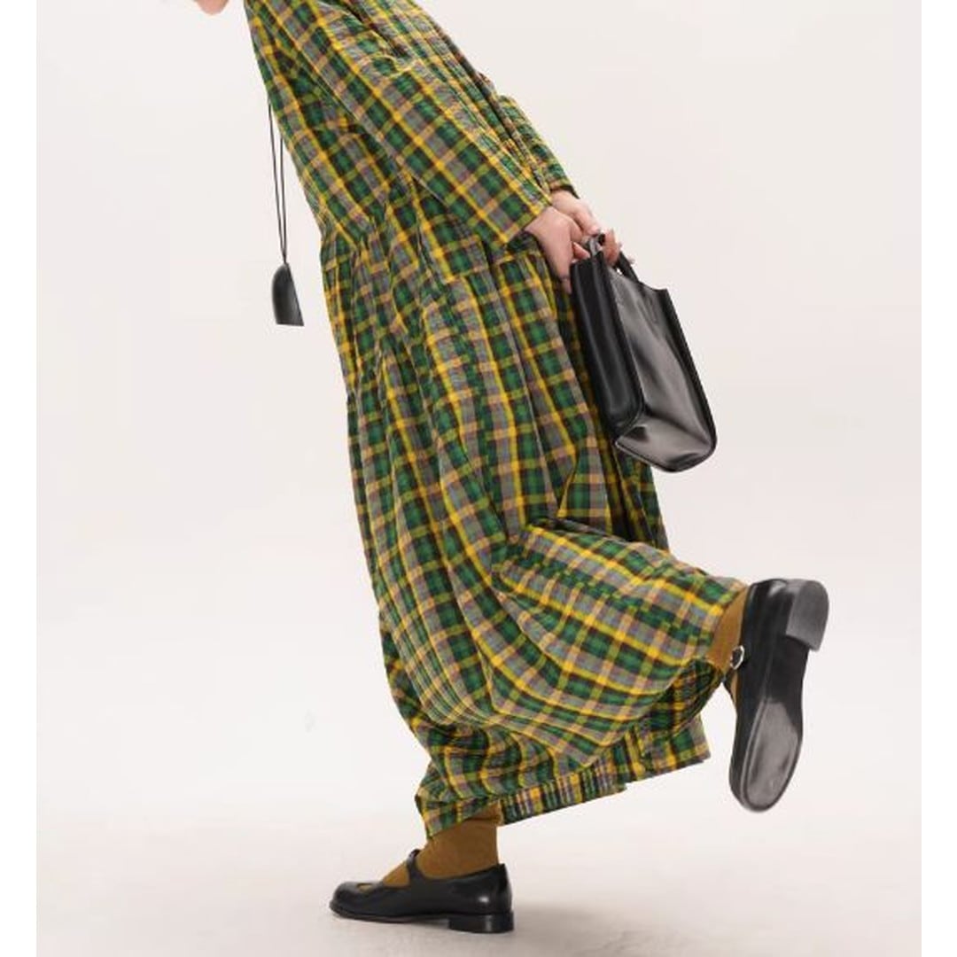 上品なチェック柄と、ギャザー切り替えから生まれるふんわりとしたシルエットが魅力的なマキシ丈ワンピース。