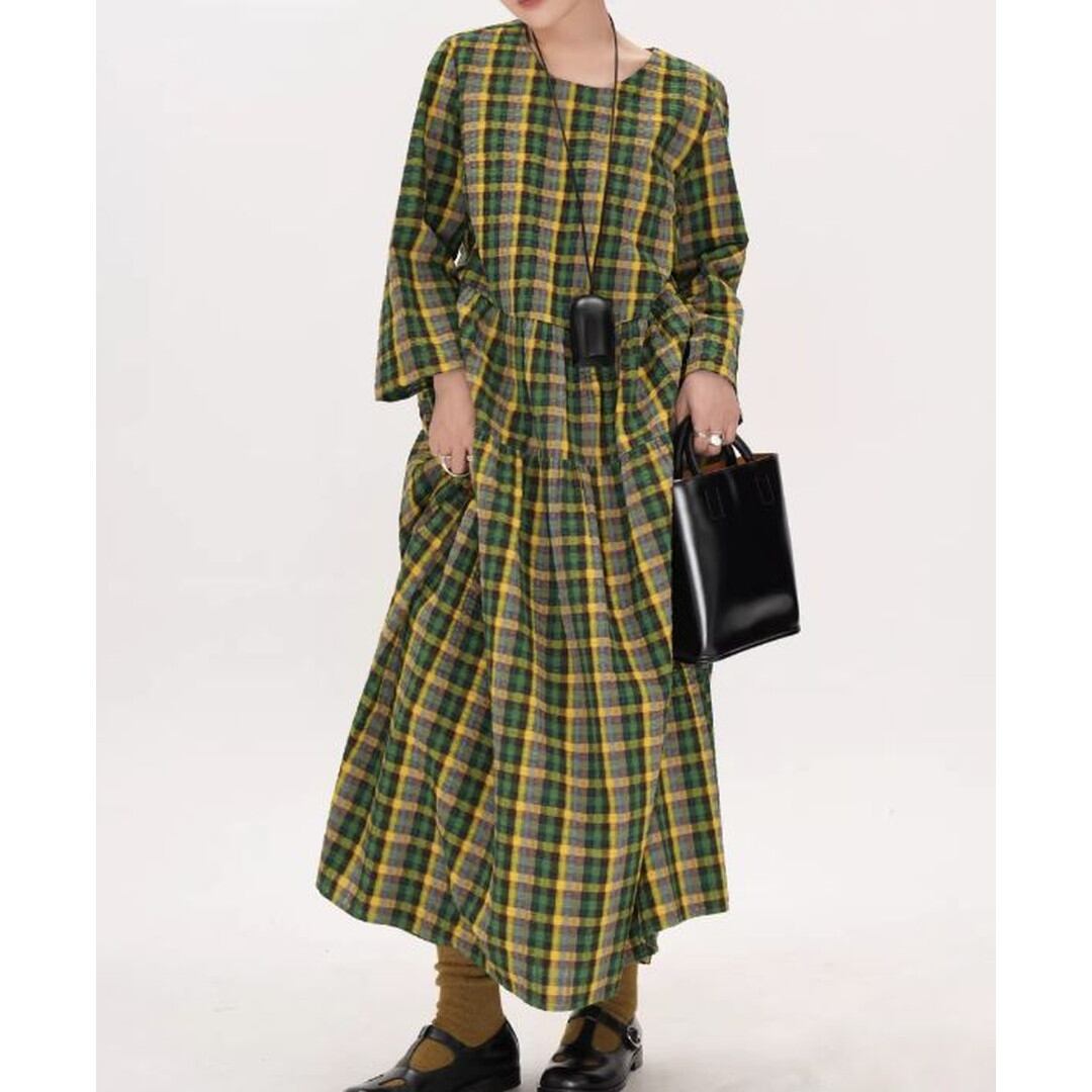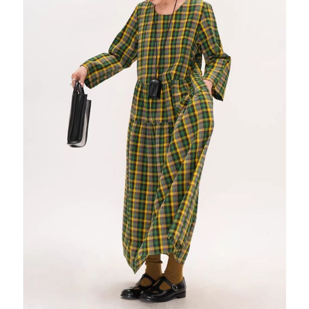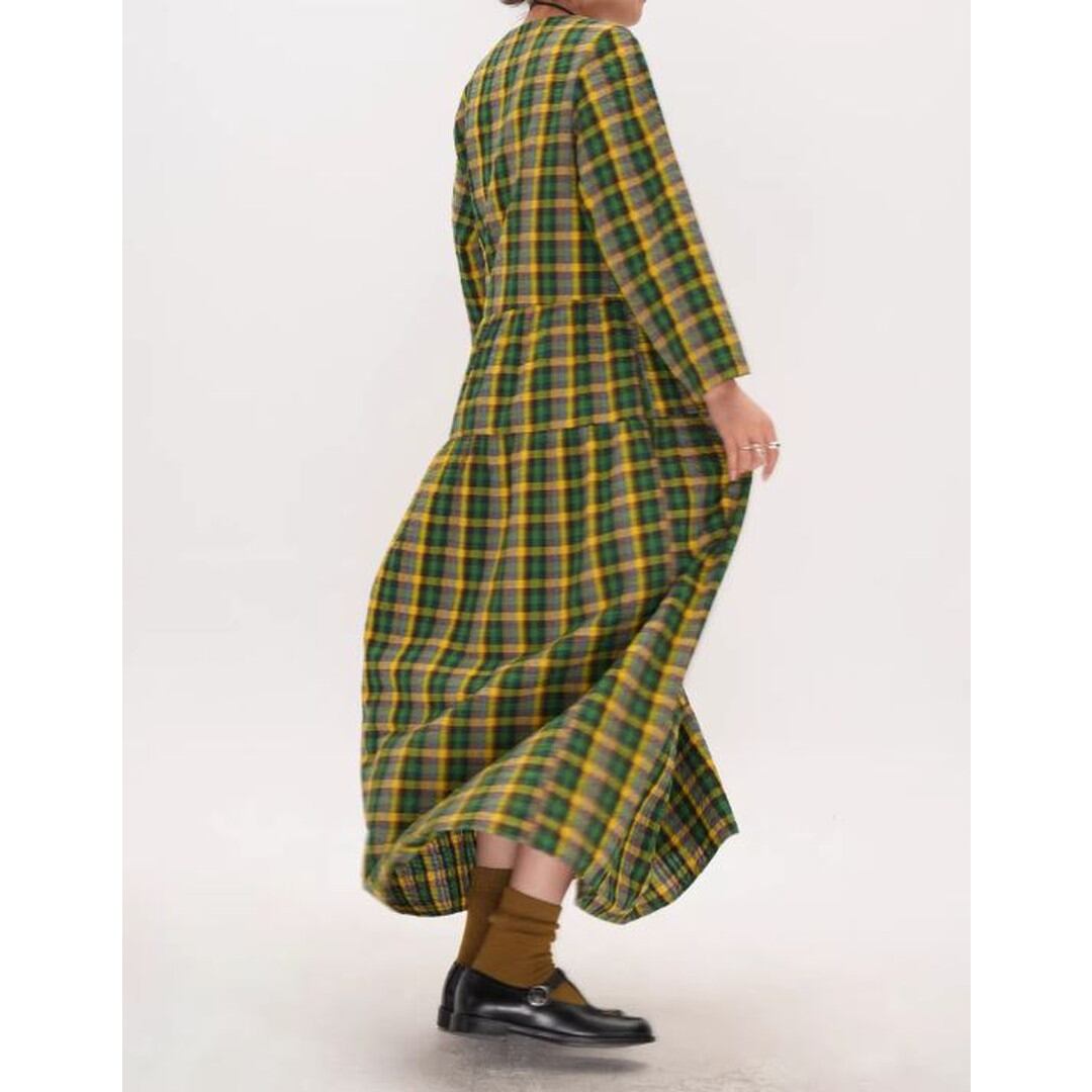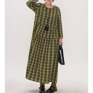 チェック柄長袖ギャザーマキシ丈ワンピース 【001856】