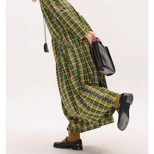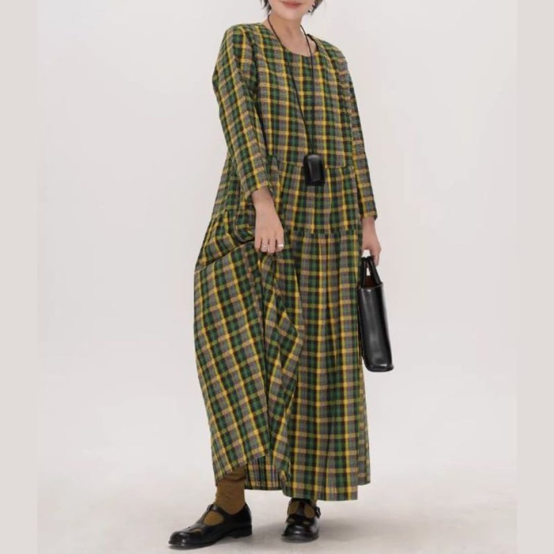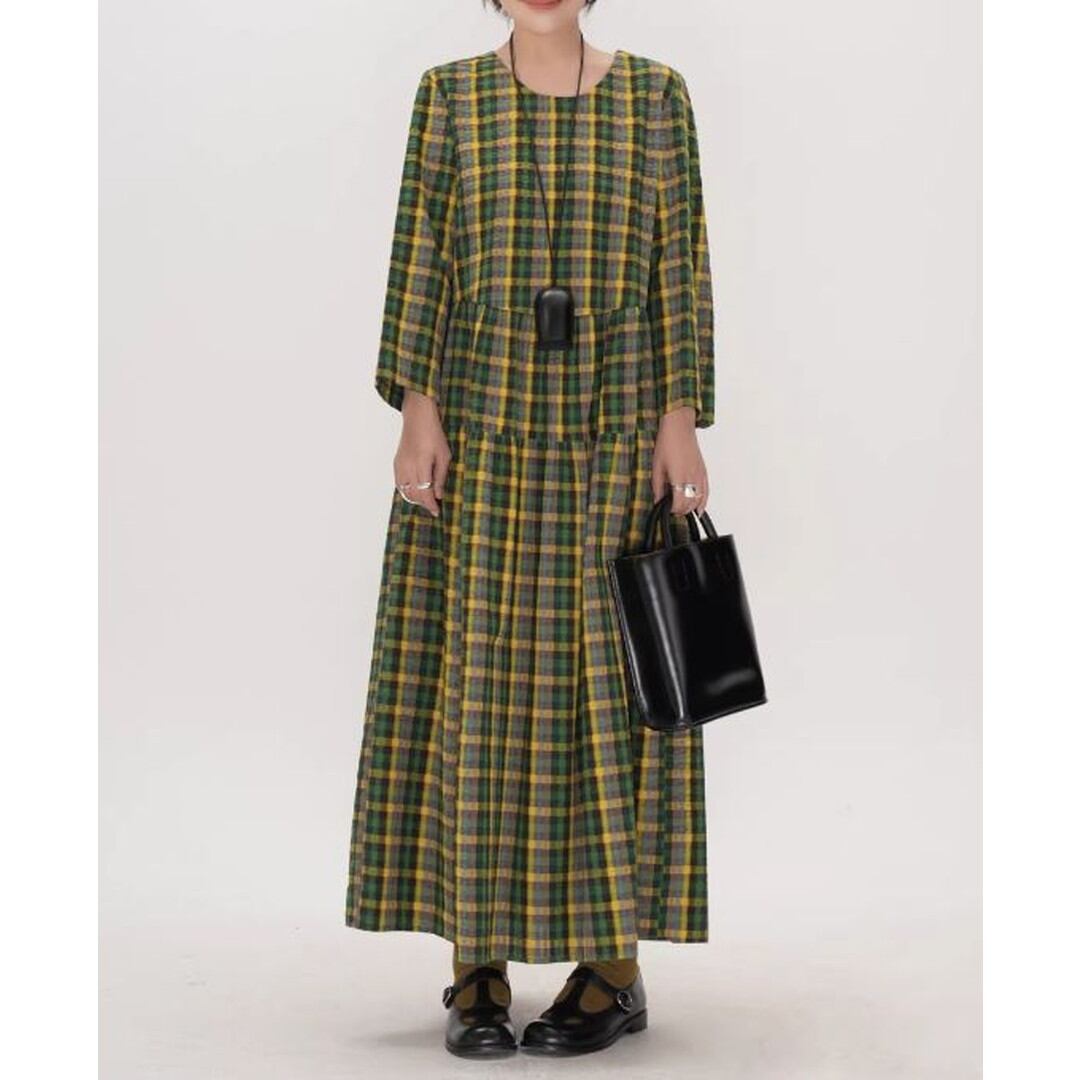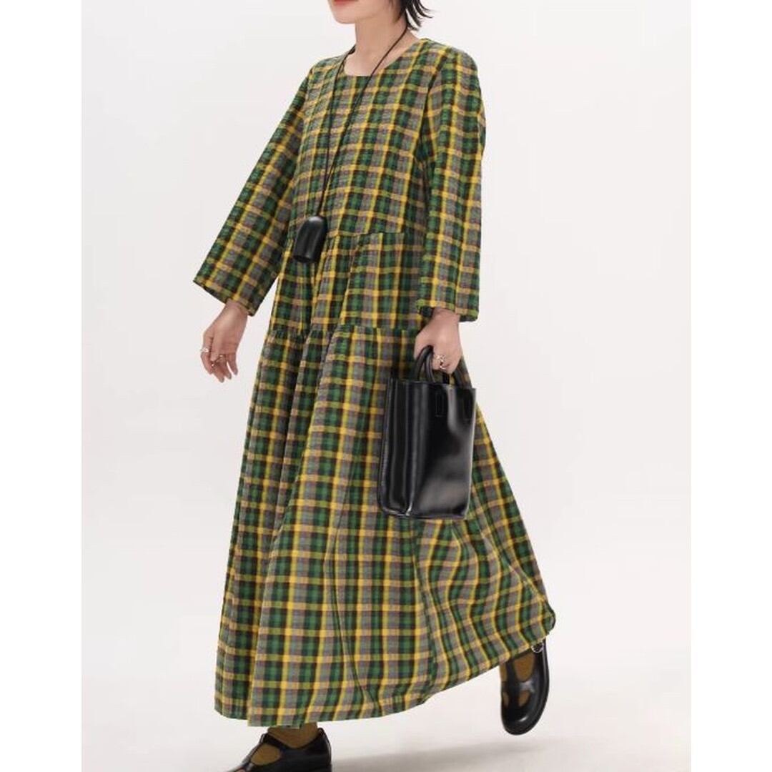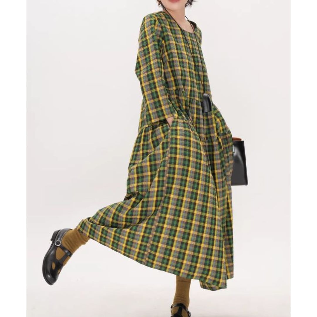 チェック柄長袖ギャザーマキシ丈ワンピース 【001856】