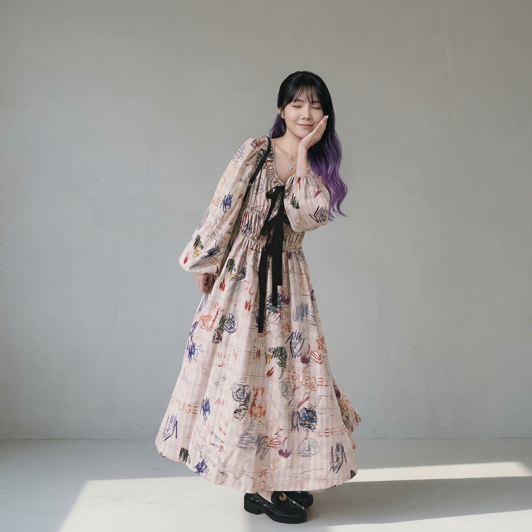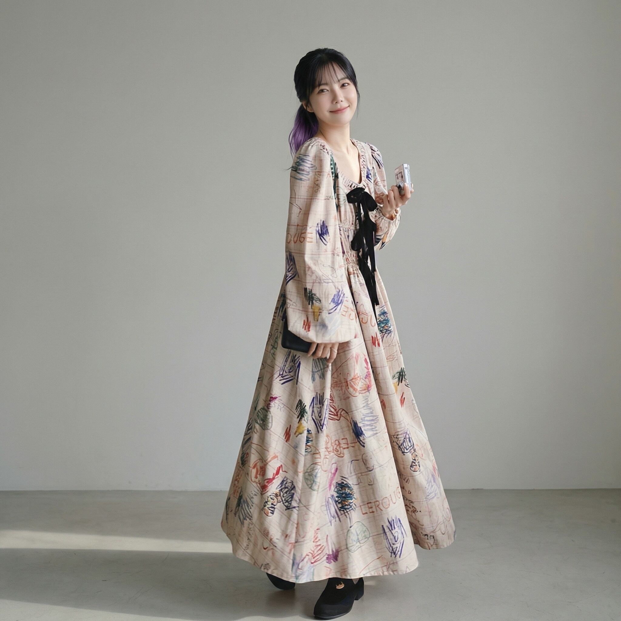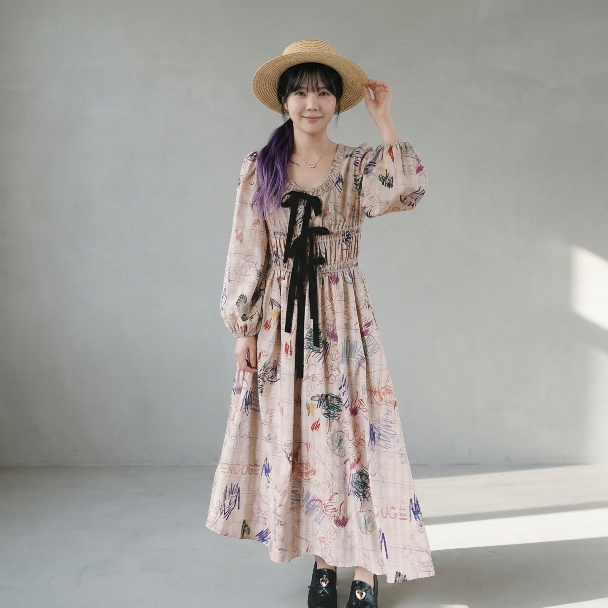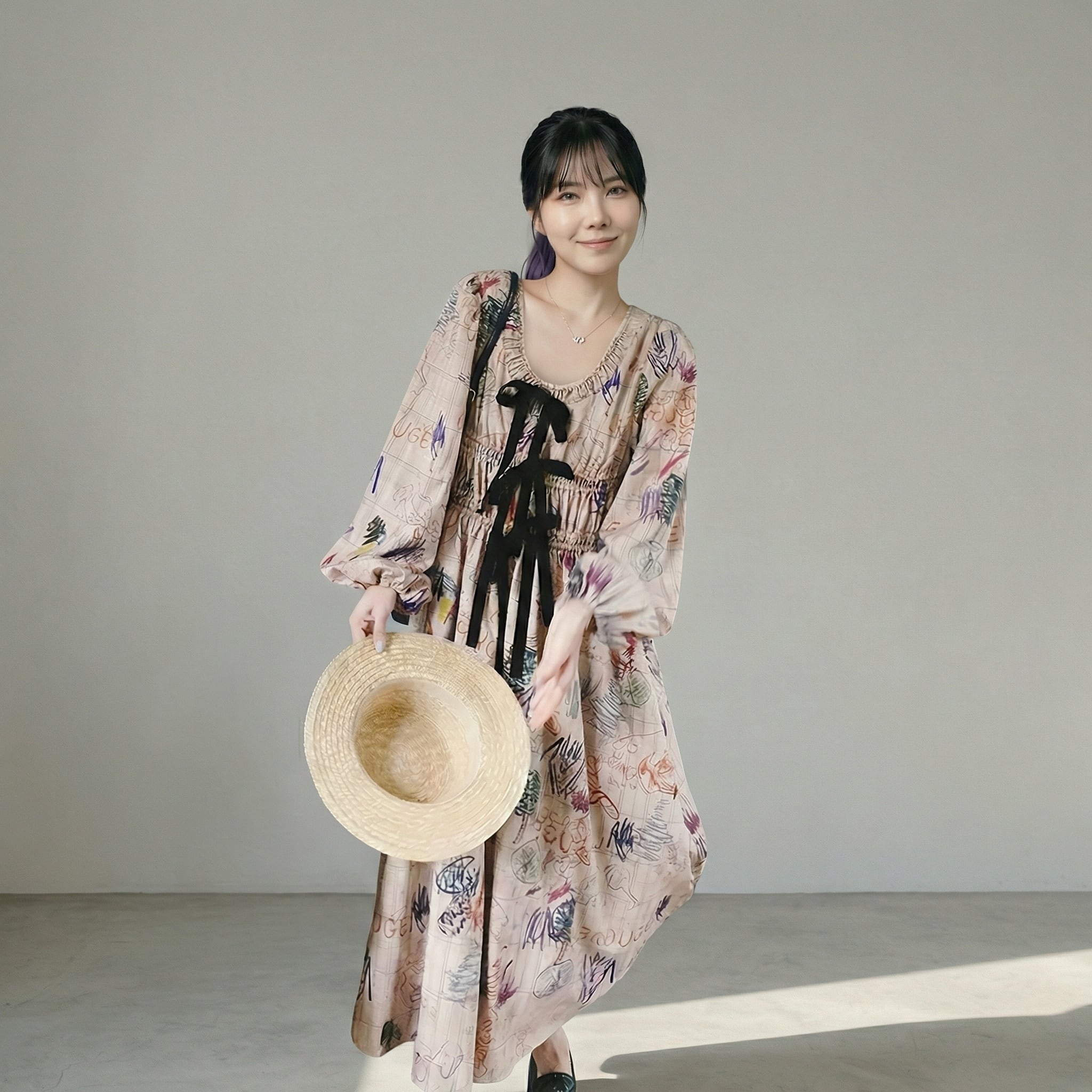 リボン付き長袖Aラインマキシ丈ワンピース 【001861】
