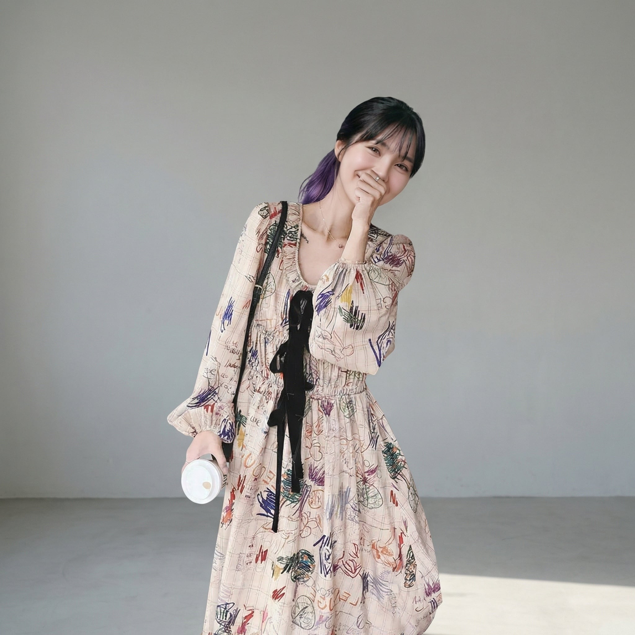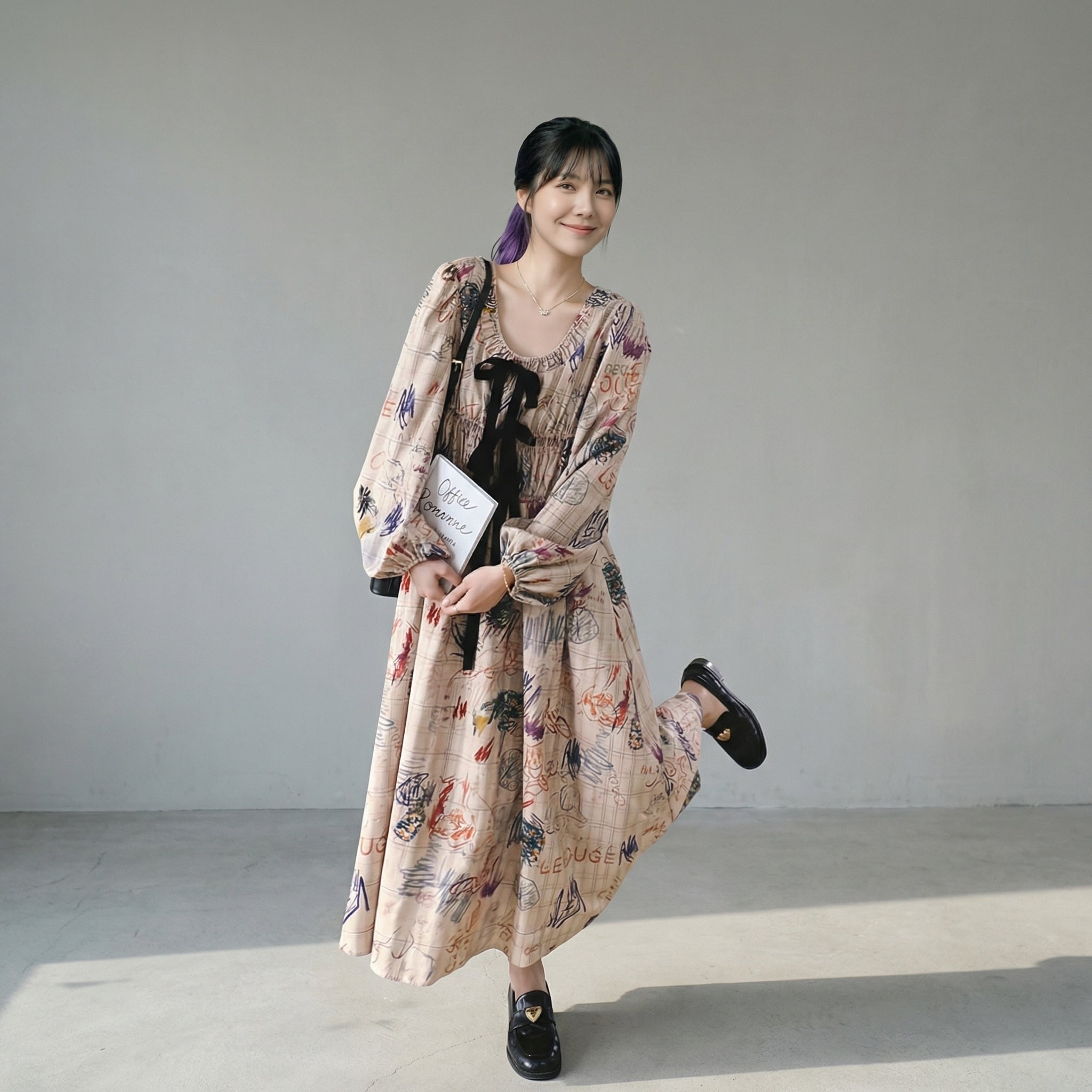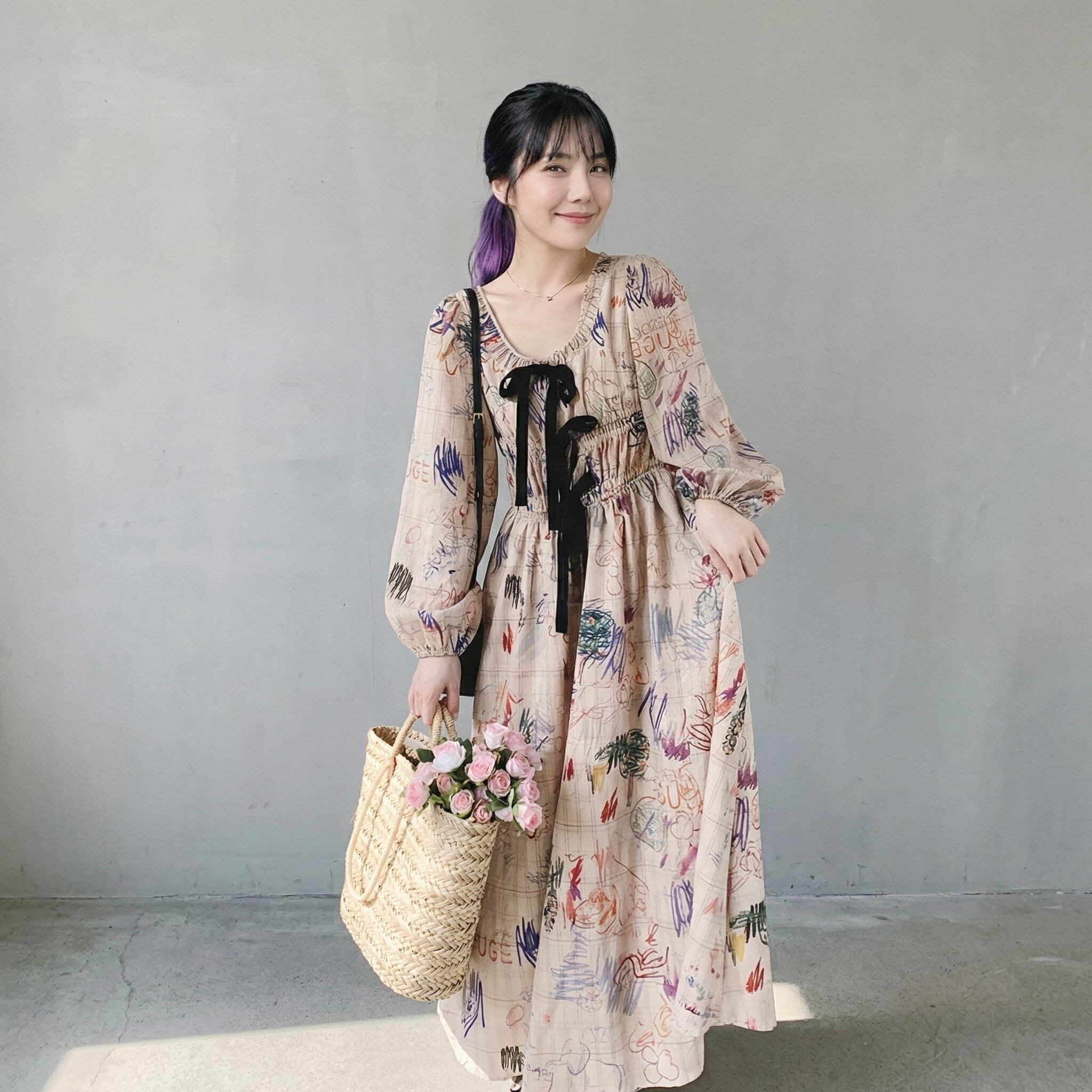 リボン付き長袖Aラインマキシ丈ワンピース 【001861】