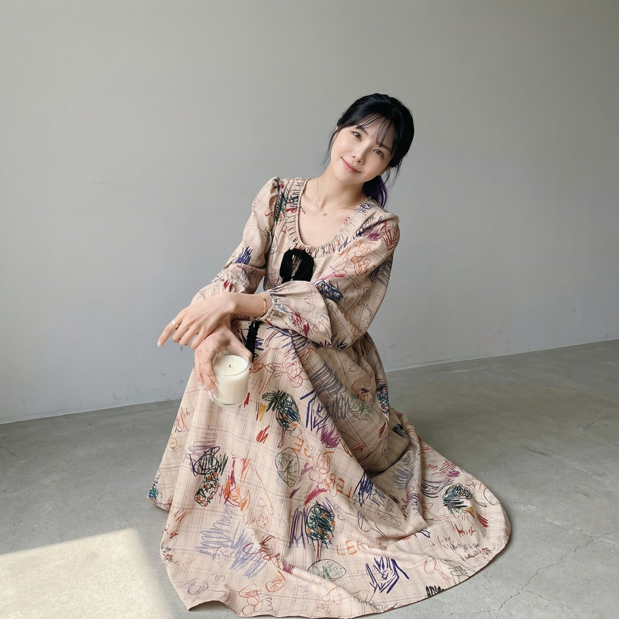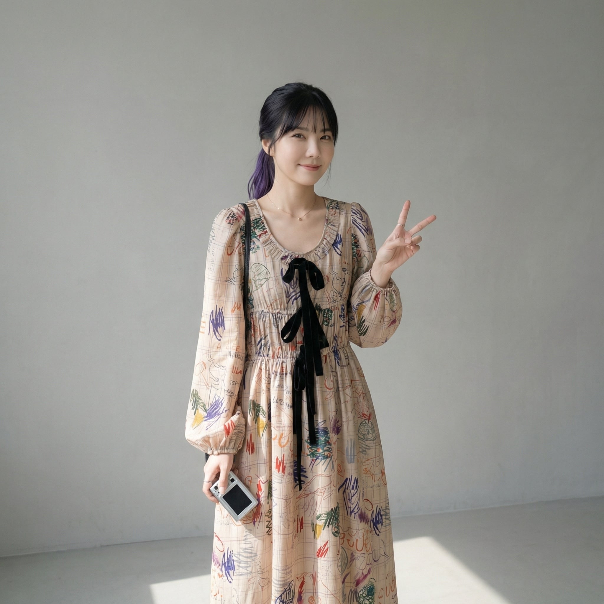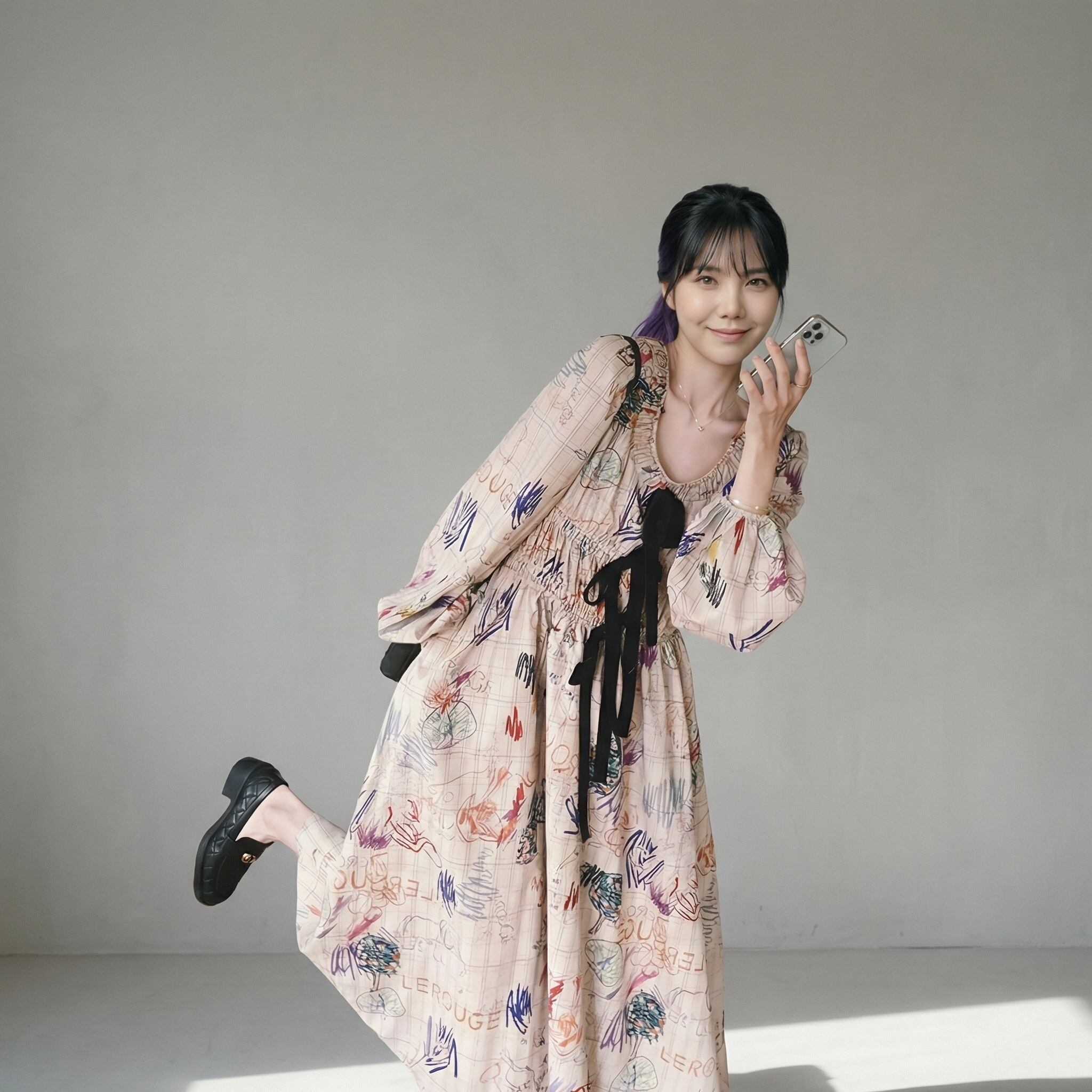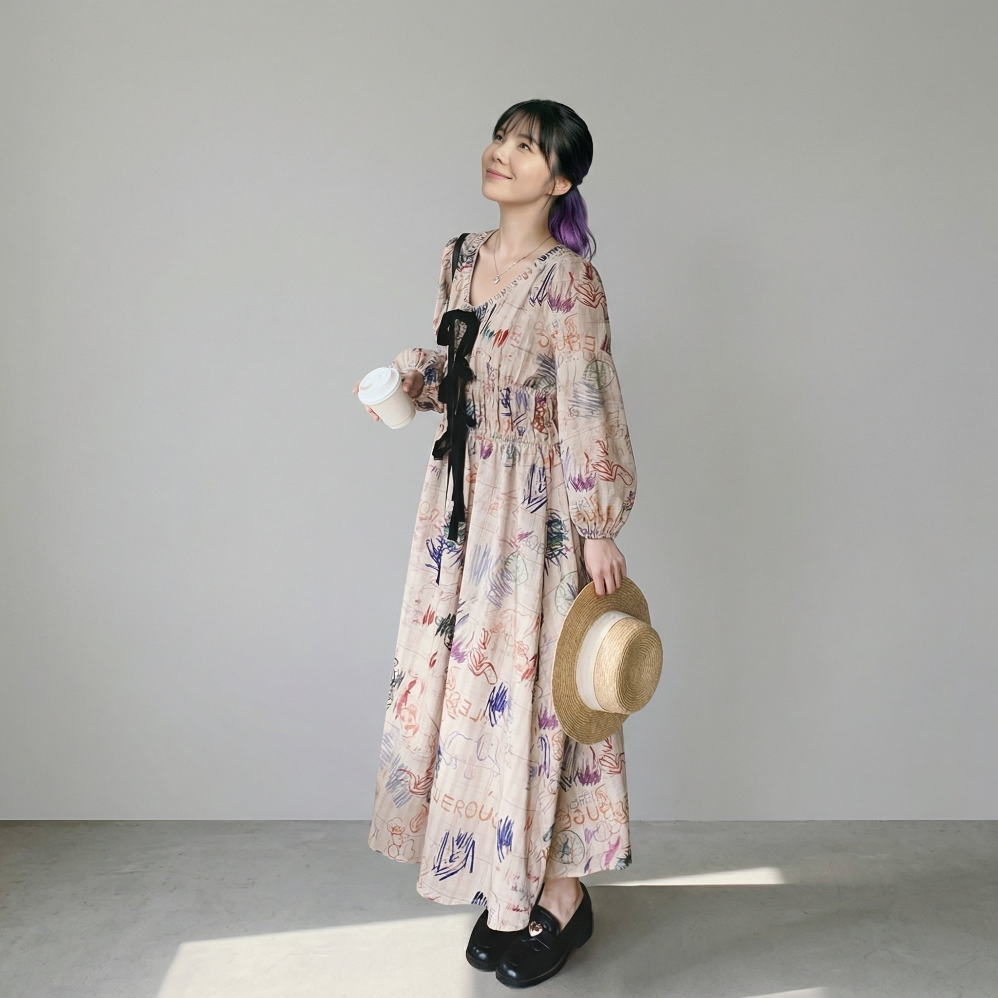 リボン付き長袖Aラインマキシ丈ワンピース 【001861】