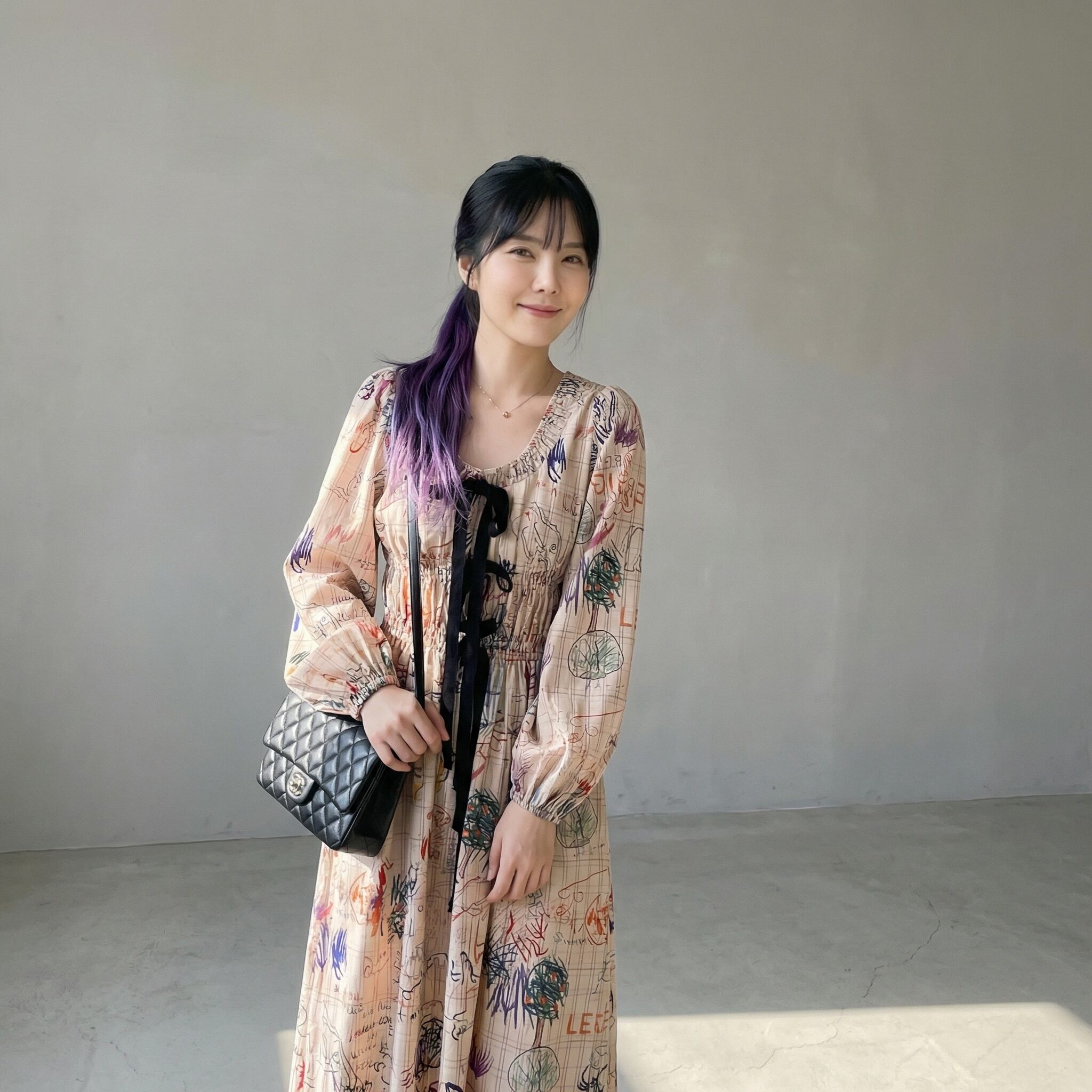 上品な柄とAラインシルエットが魅力のマキシ丈ワンピース。