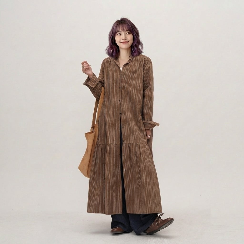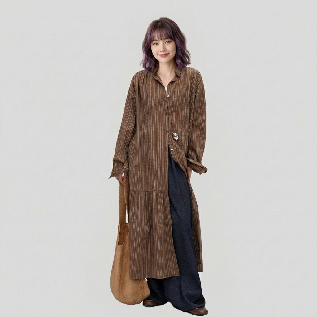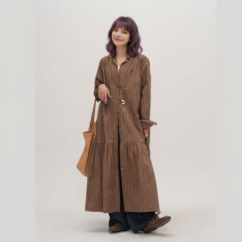ストライプ柄長袖ティアードマキシ丈シャツワンピース 【001866】