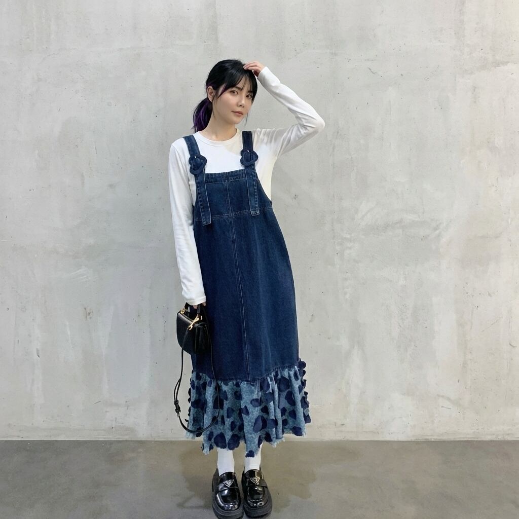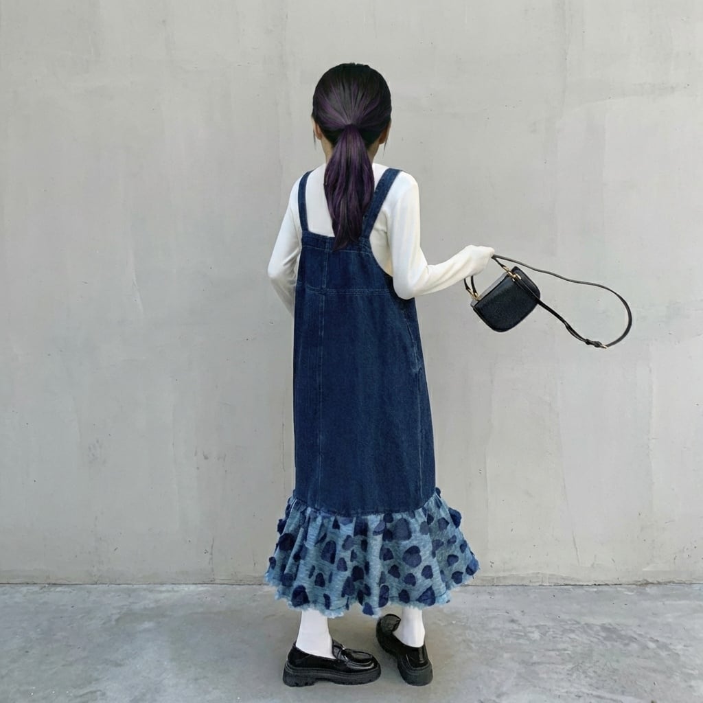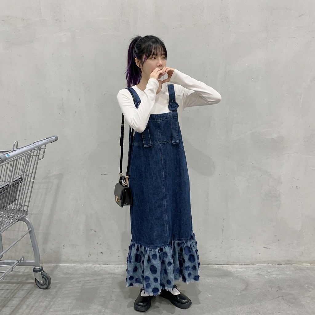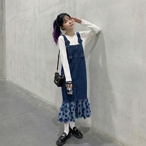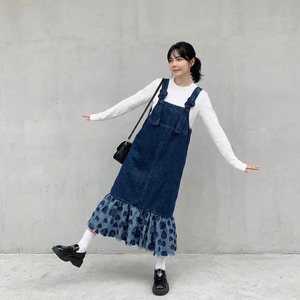 フリルマキシ丈デニムオーバーオールワンピース 【001863】