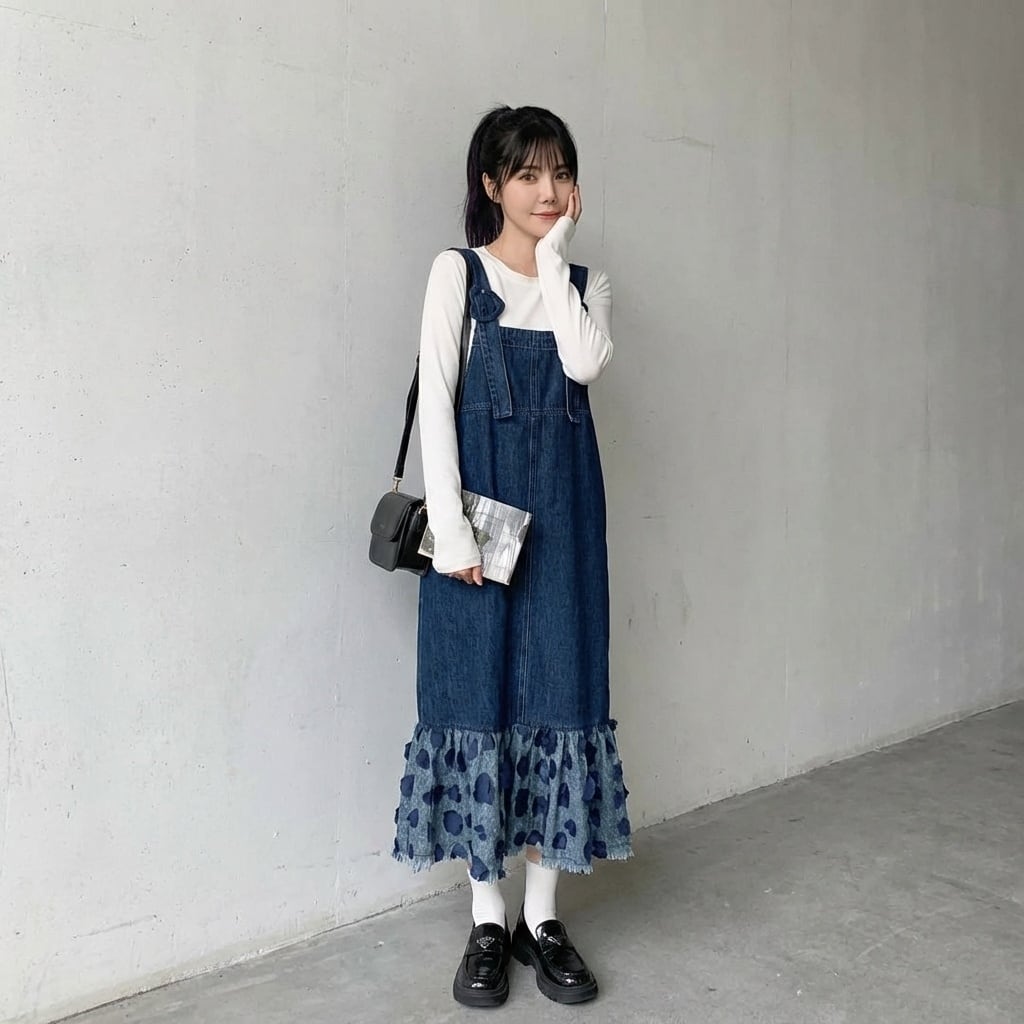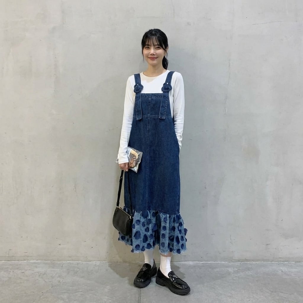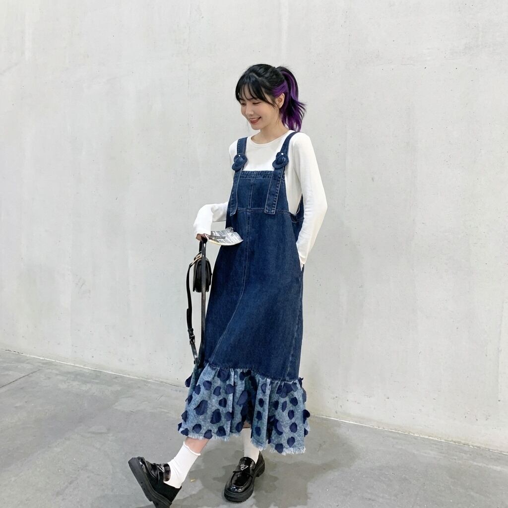 フリルマキシ丈デニムオーバーオールワンピース 【001863】