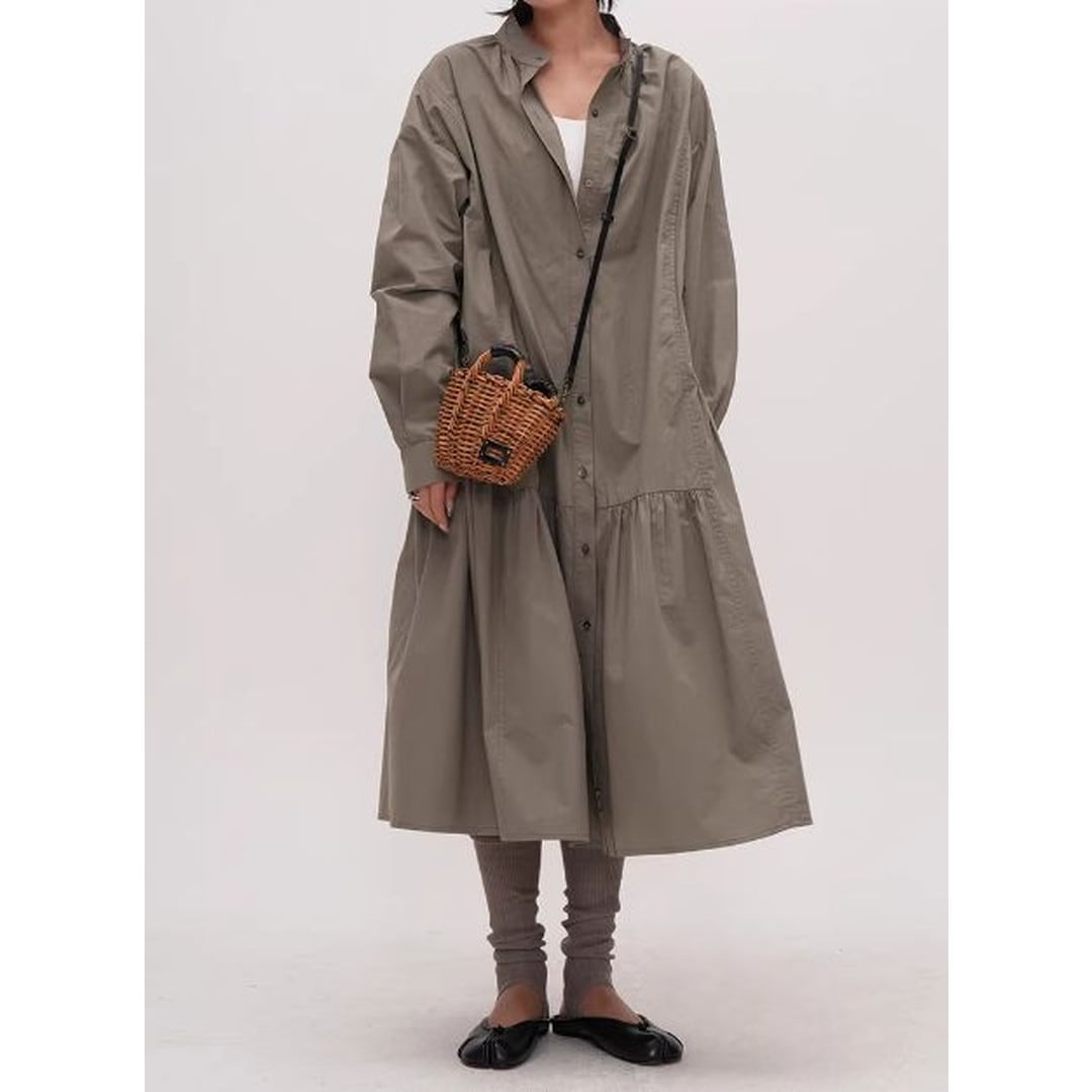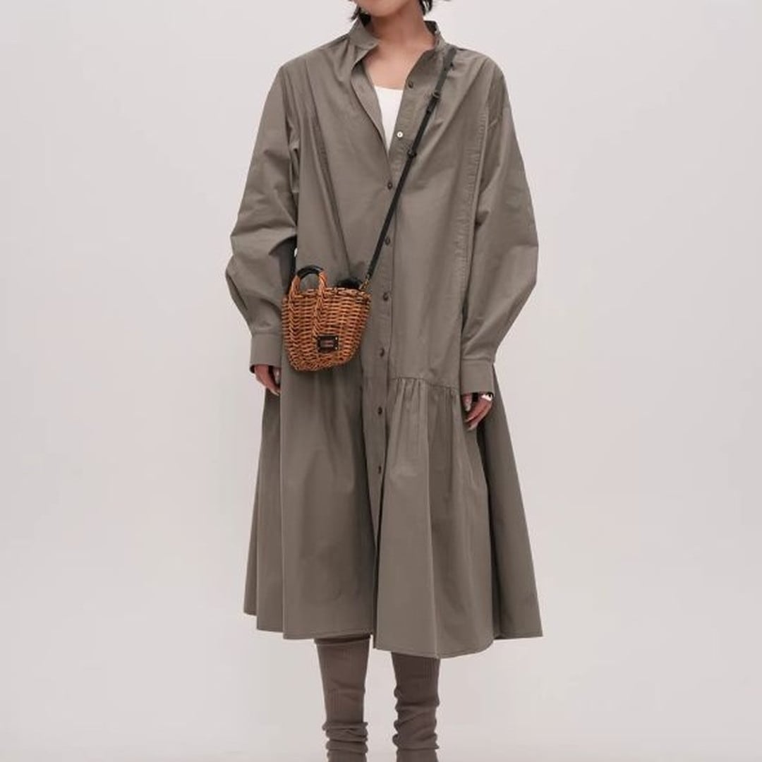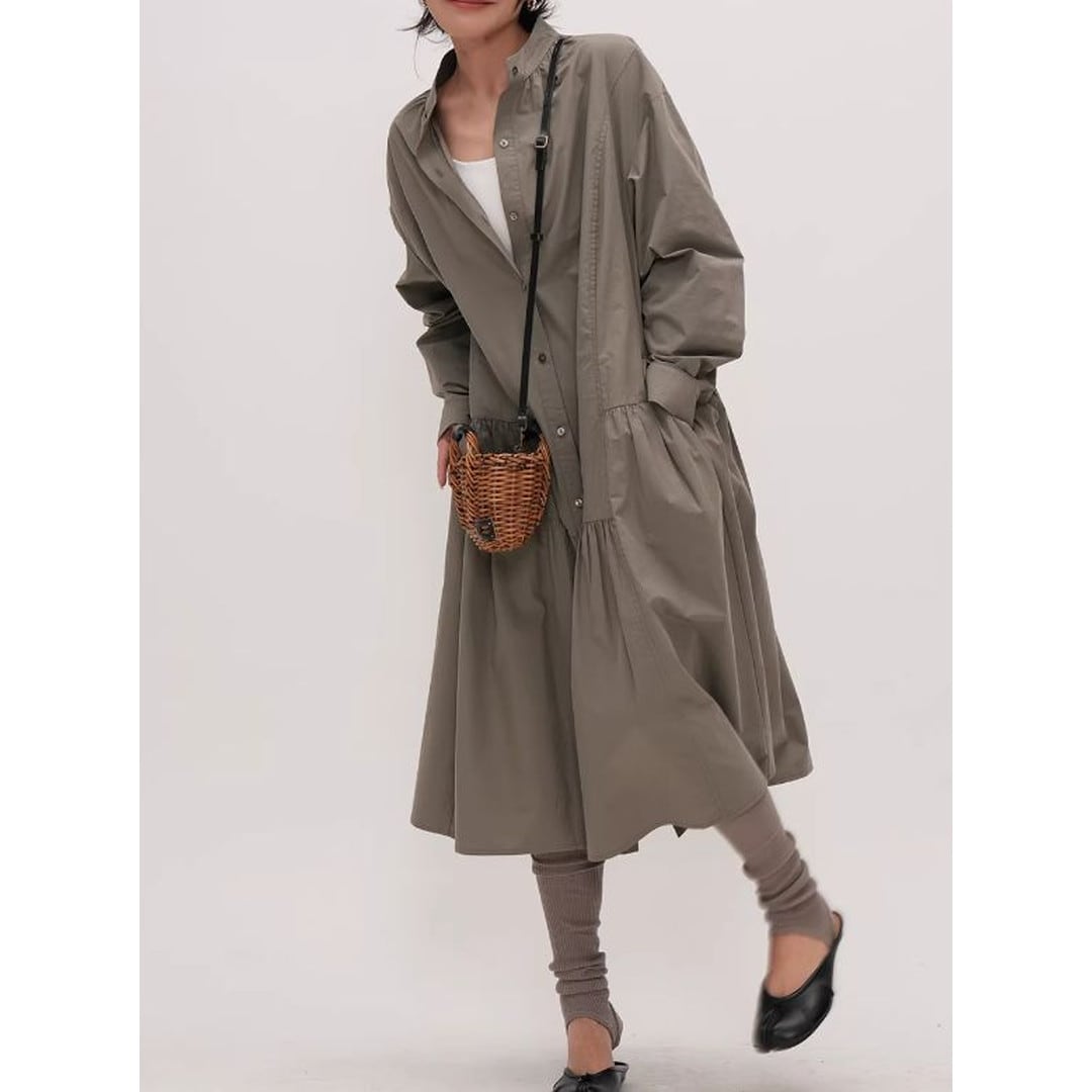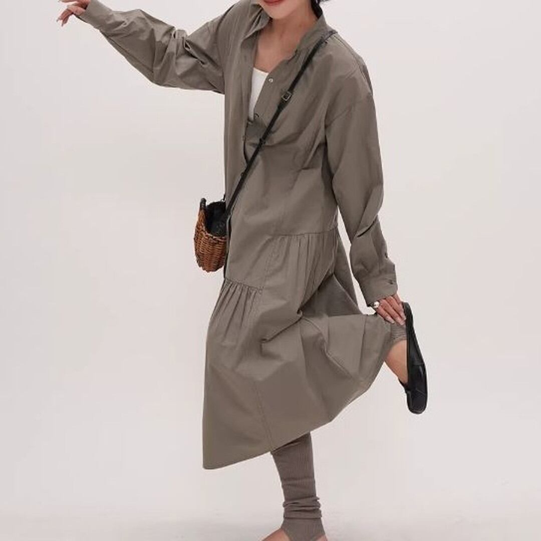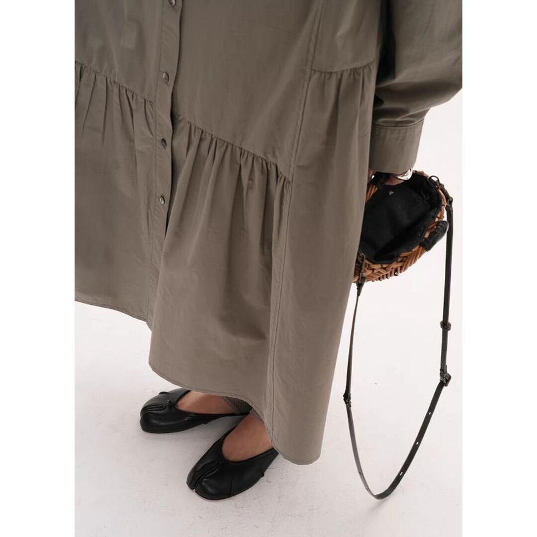 シンプルなデザインの中に、ティアード切り替えがさりげないアクセントを加えるシャツワンピース。