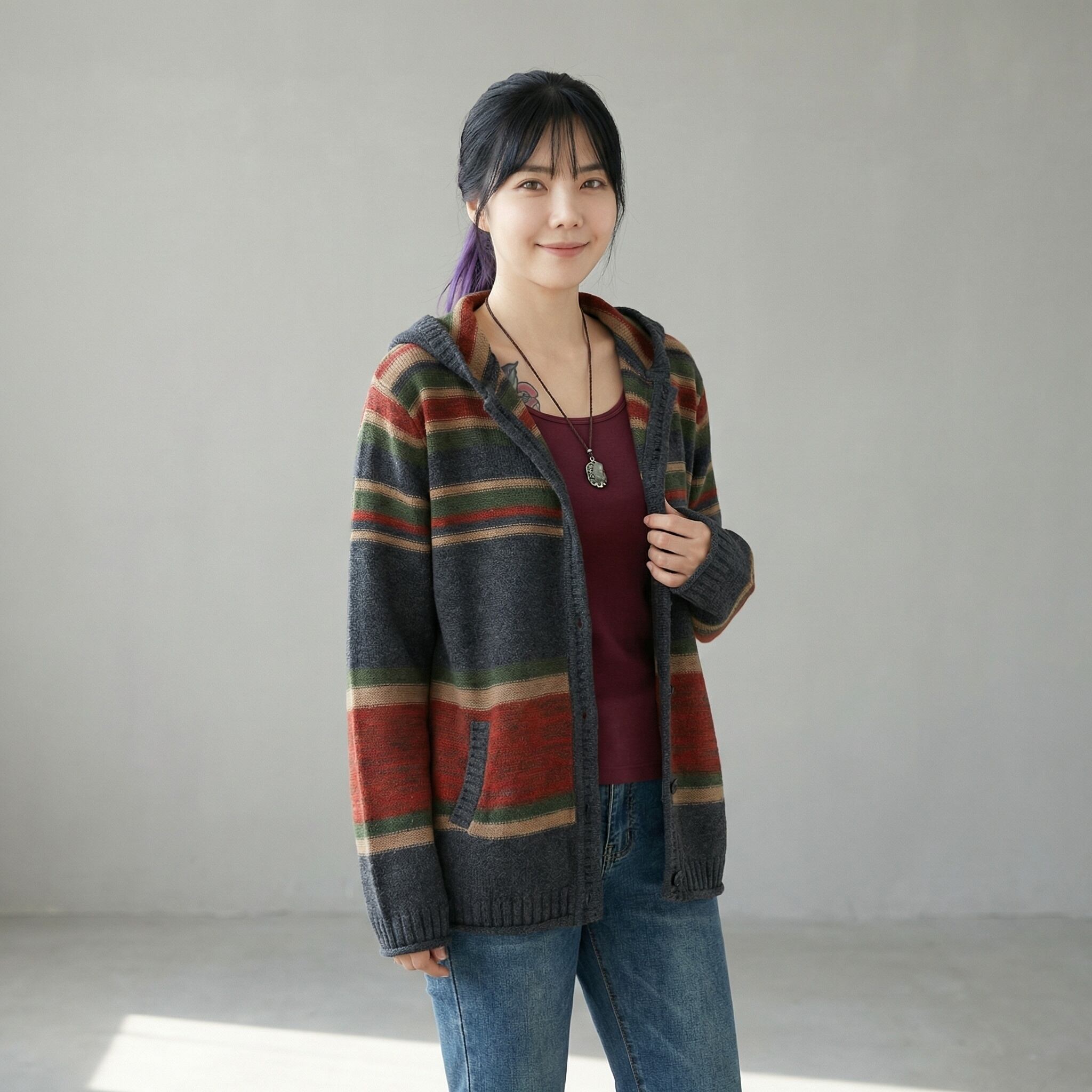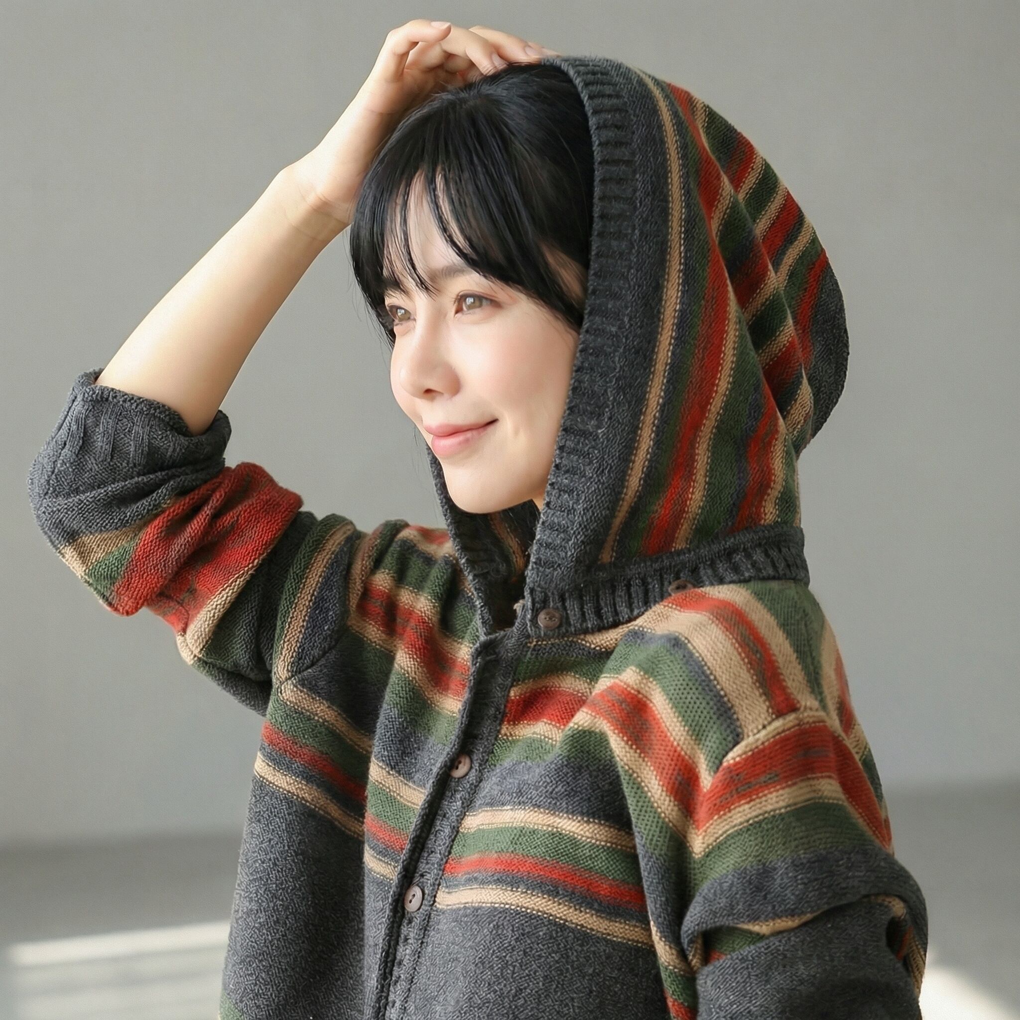 長袖 ボーダー柄取り外せるフード付きニットカーディガン【001590】