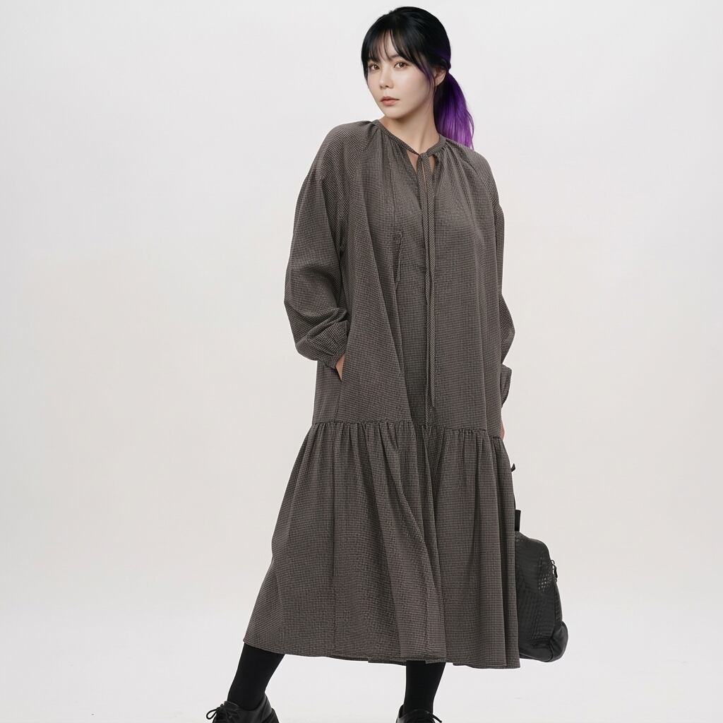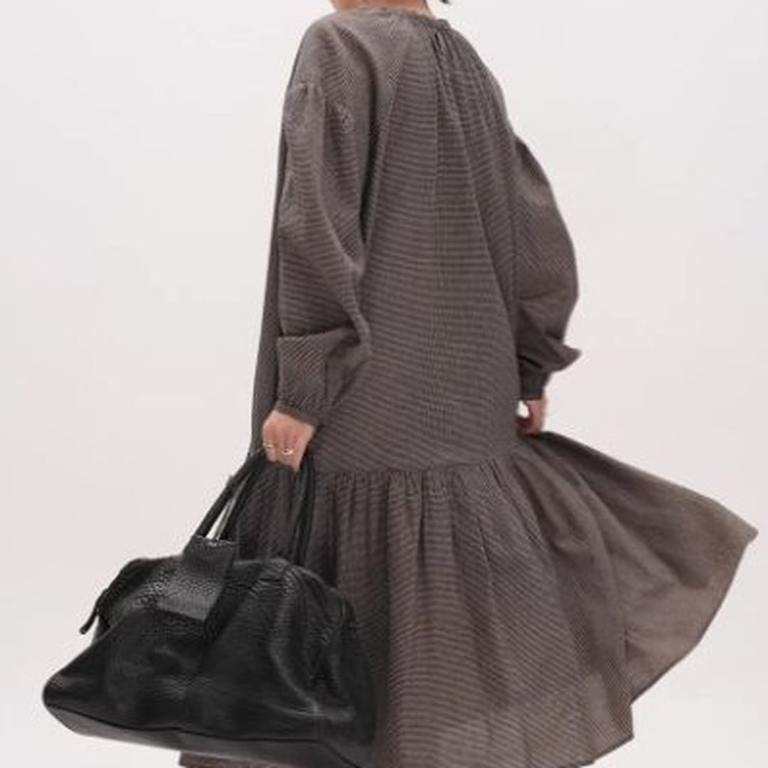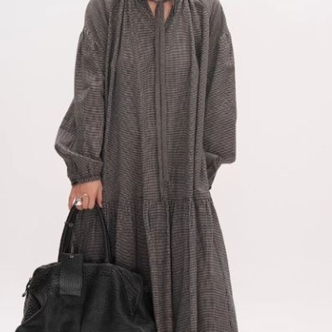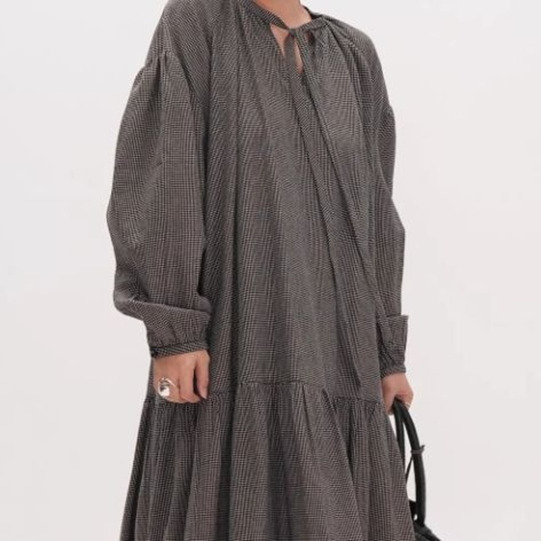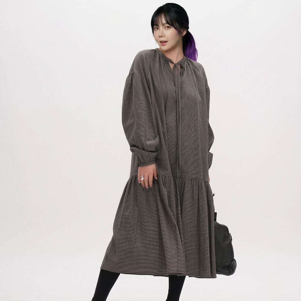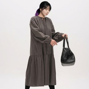 ドローストリング長袖ミモレ丈ティアードワンピース 【001869】