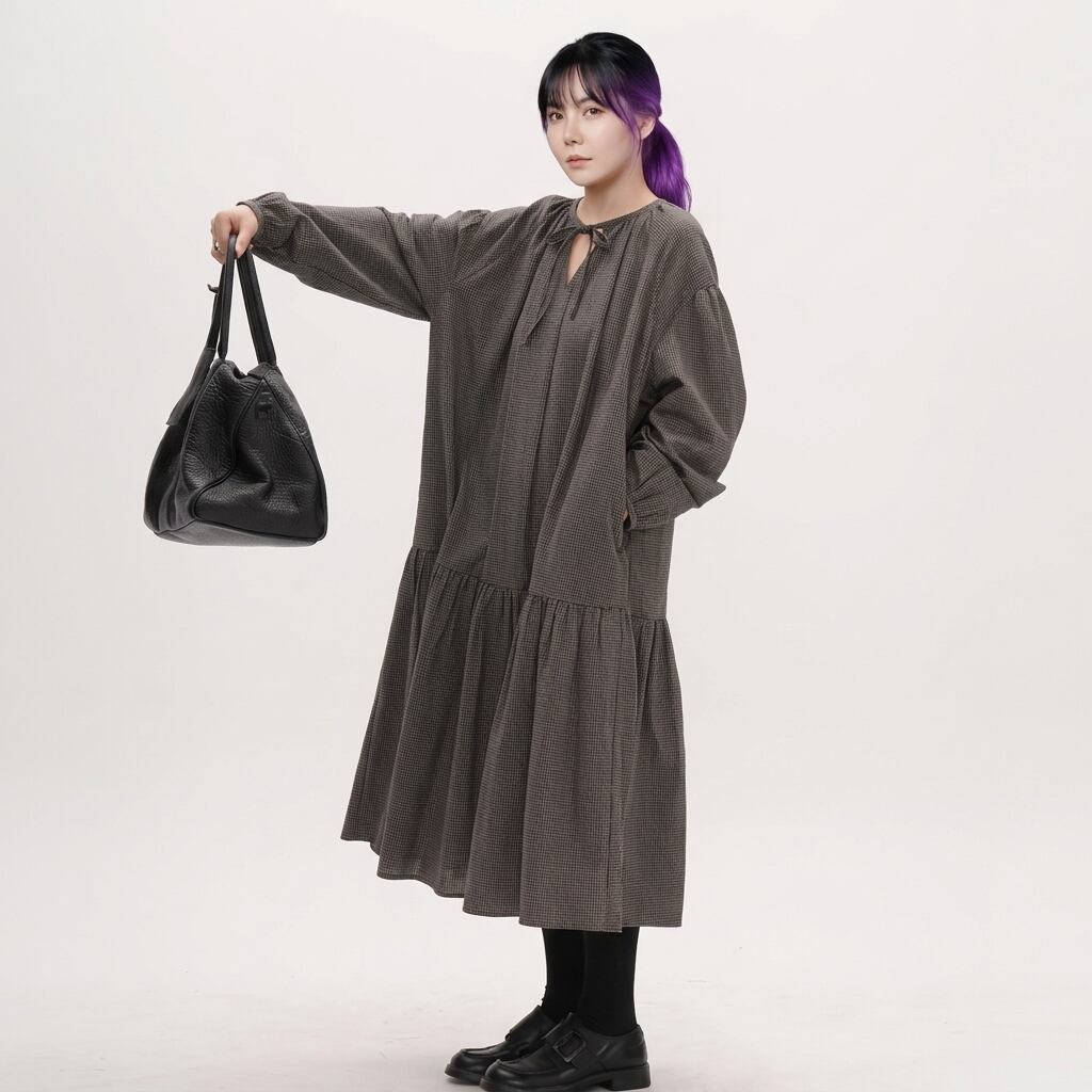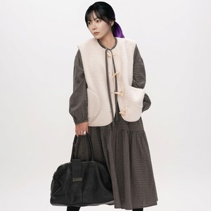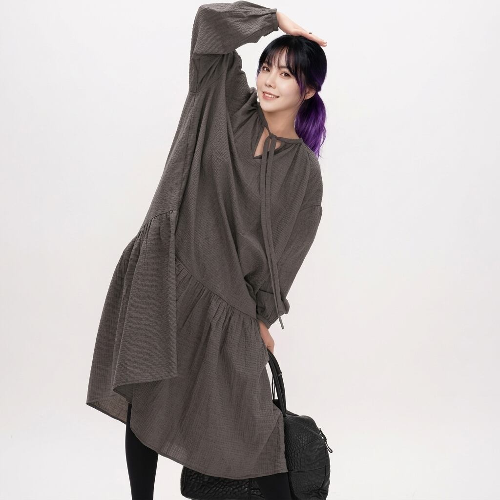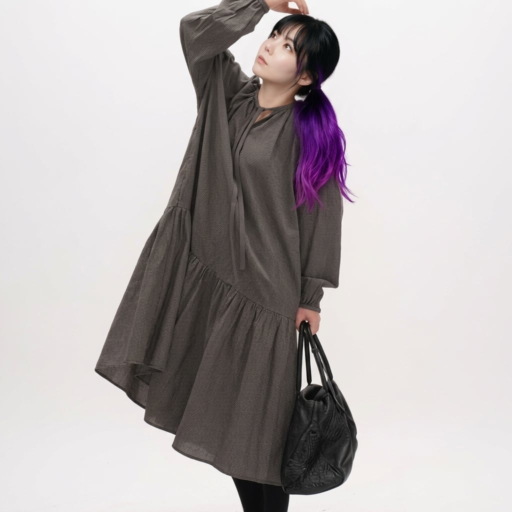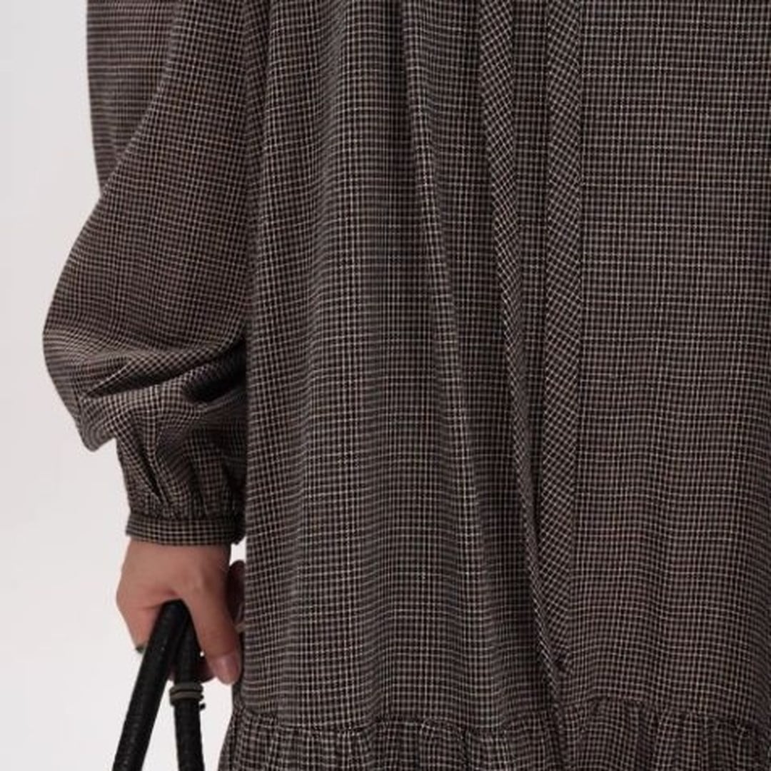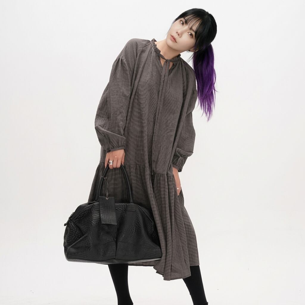 ドローストリング長袖ミモレ丈ティアードワンピース 【001869】