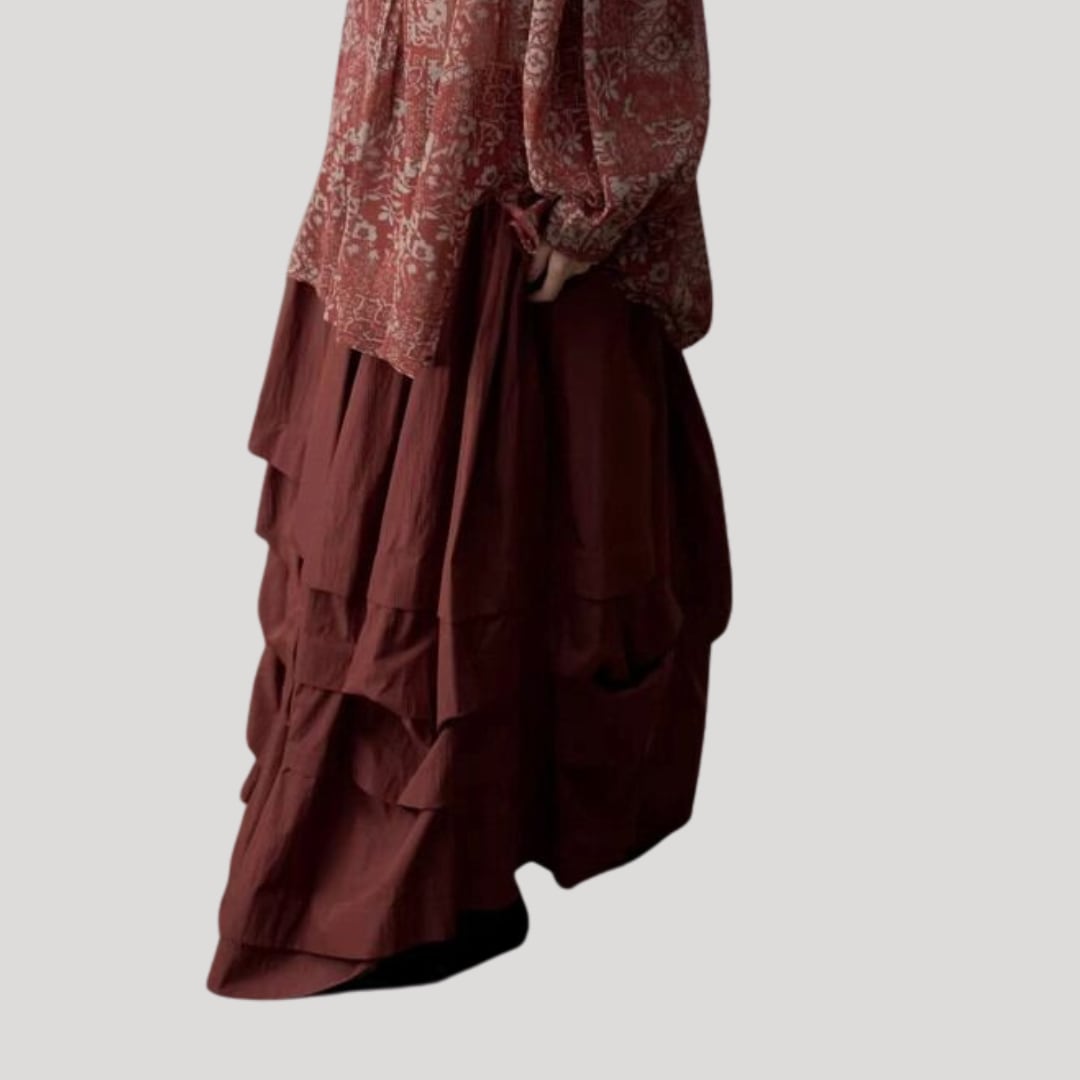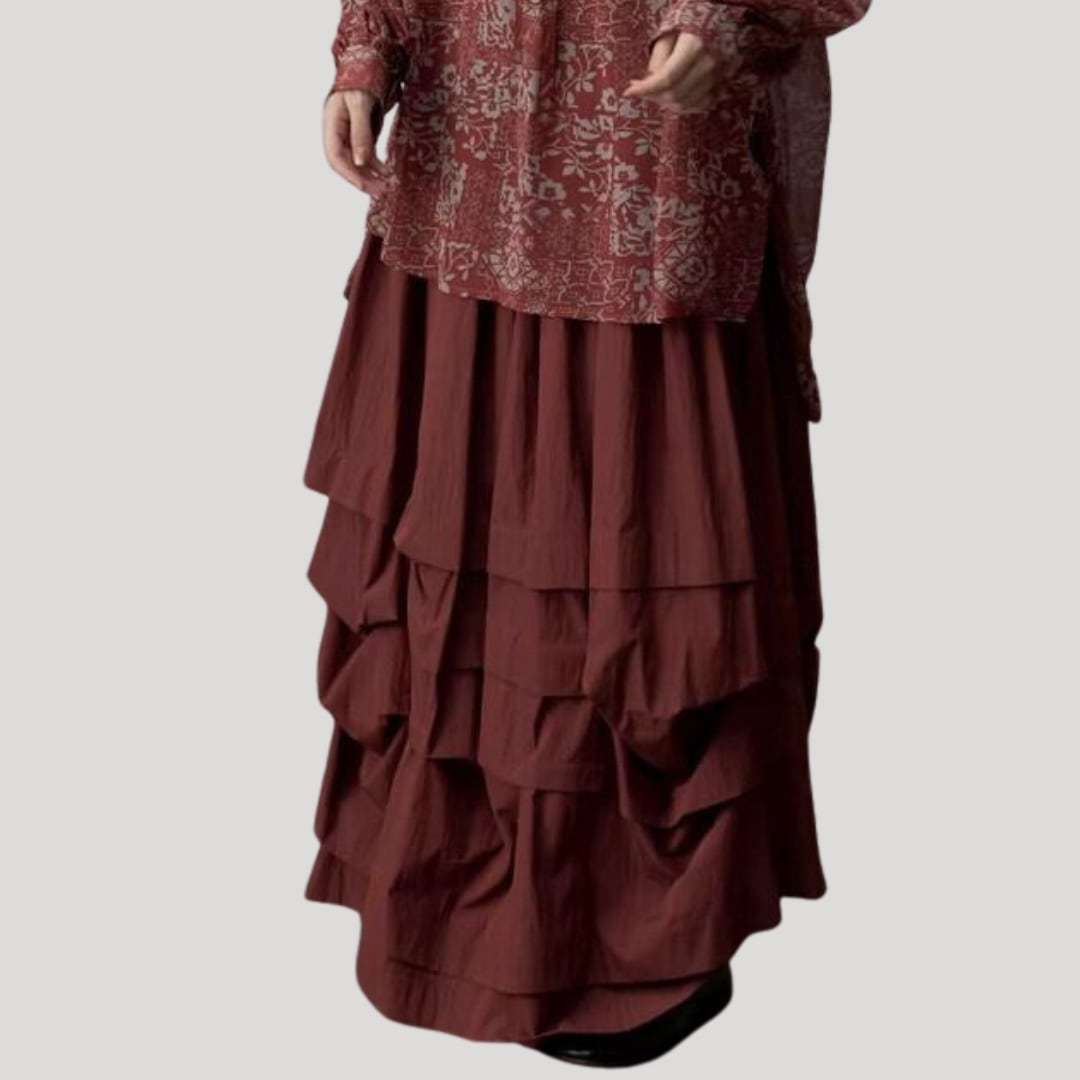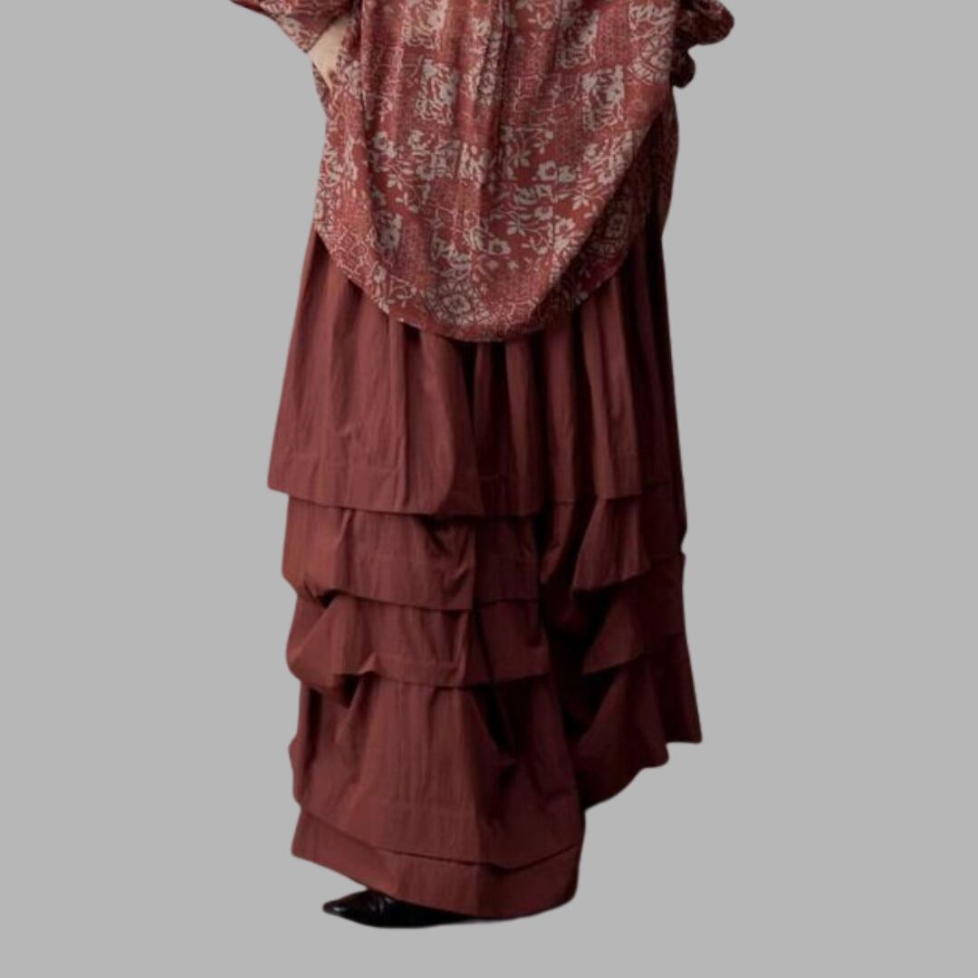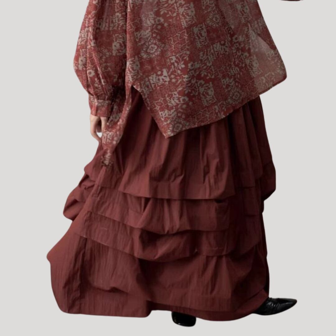 ティアードデザインが目を引く、ミモレ丈のAラインスカート。