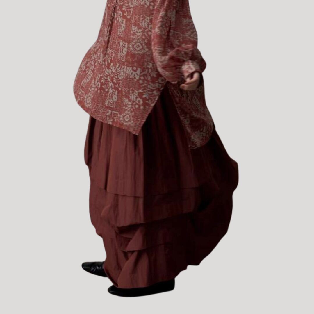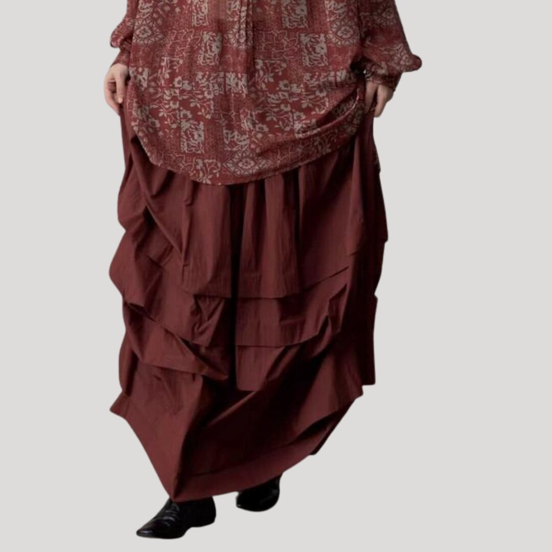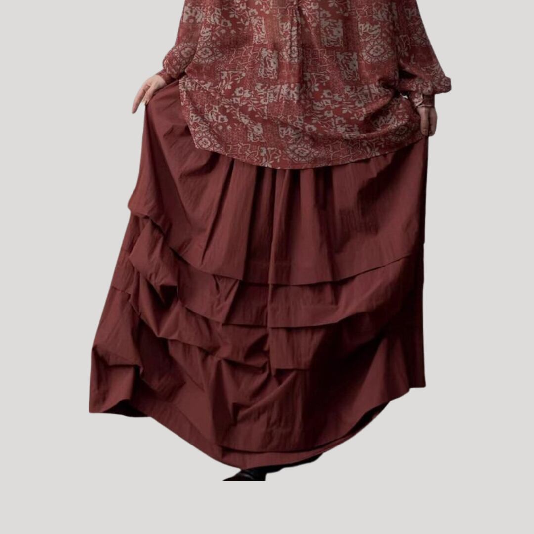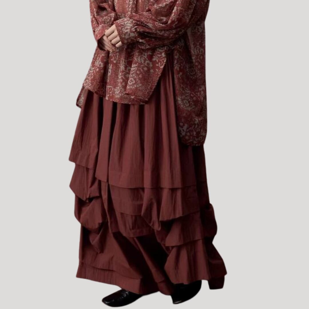 ティアードデザインが目を引く、ミモレ丈のAラインスカート。