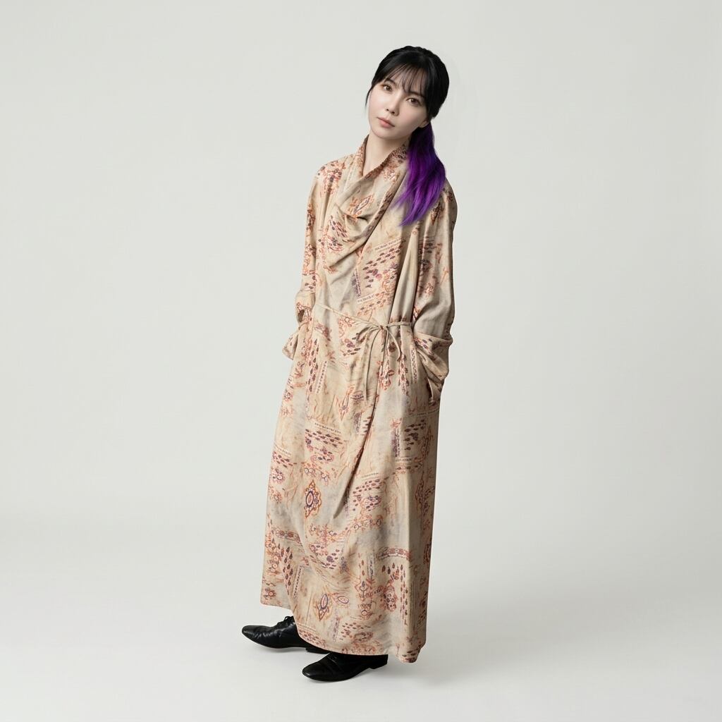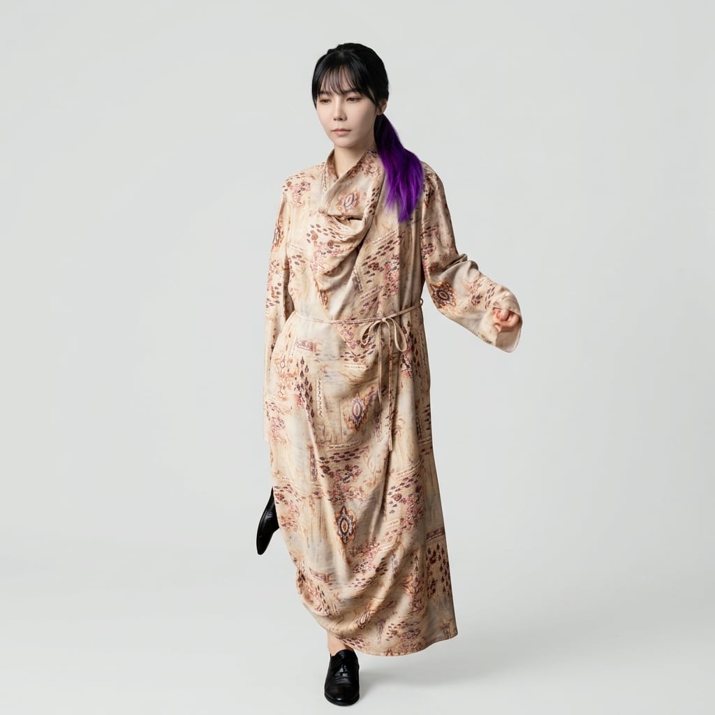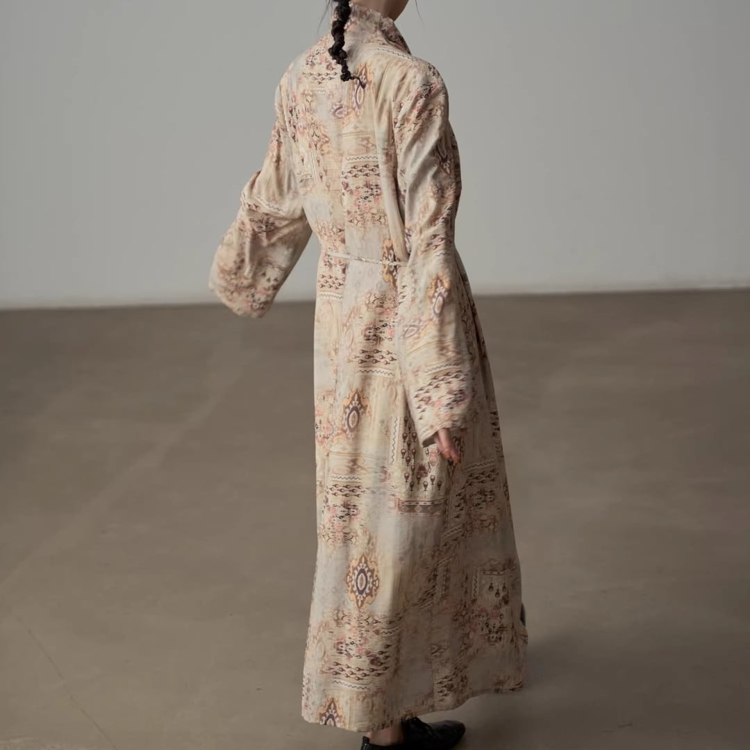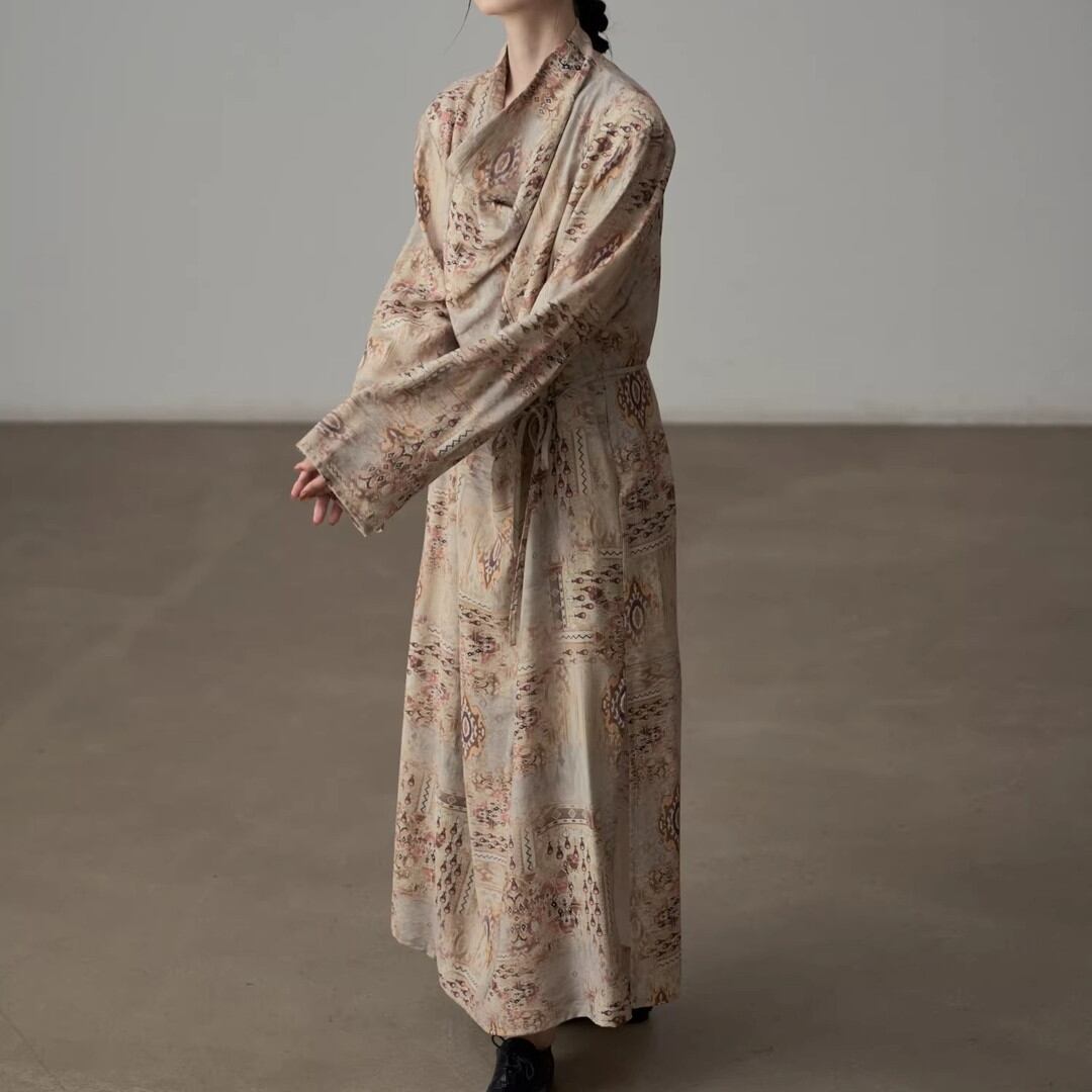 上品な柄と、ドレープネックが魅力のマキシ丈ワンピース。