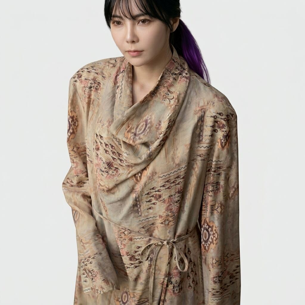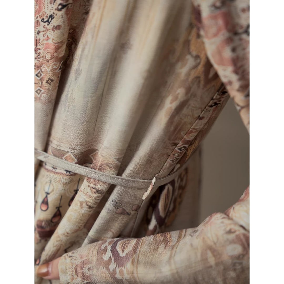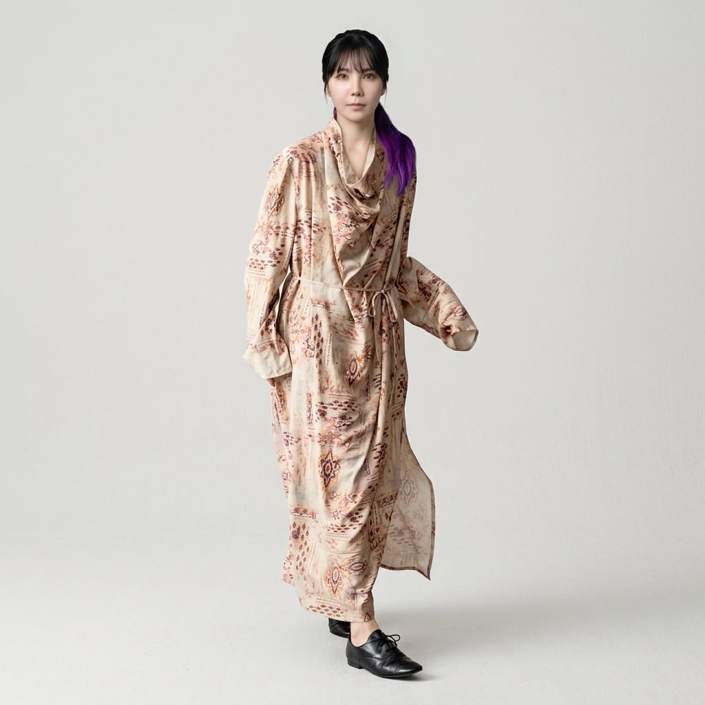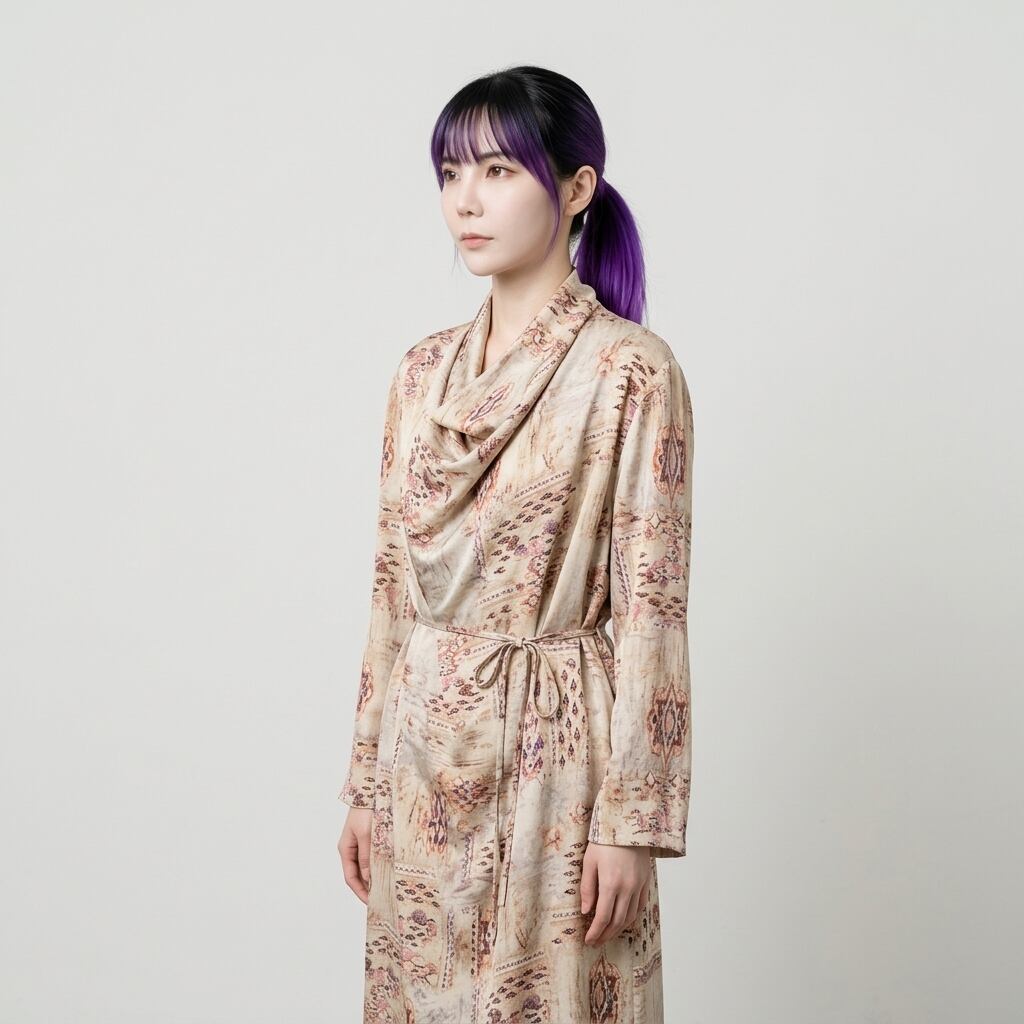 上品な柄と、ドレープネックが魅力のマキシ丈ワンピース。