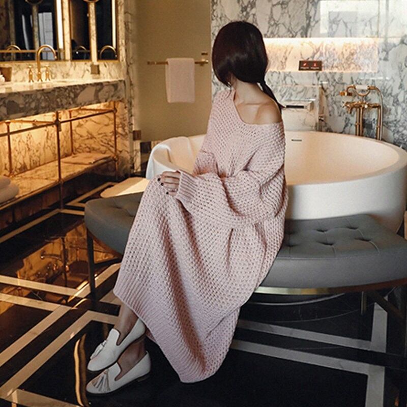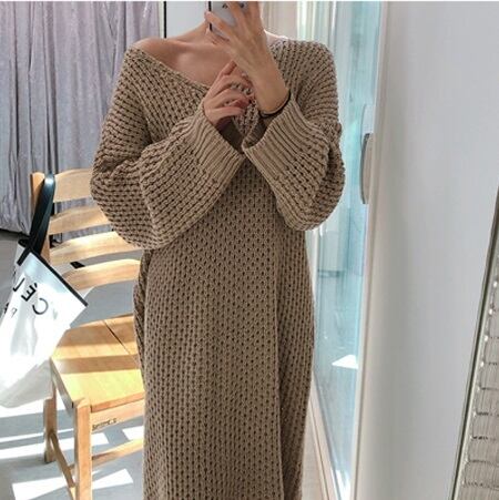 アプリコット・ブルーの2色展開のルーズネックのセーターワンピースです。