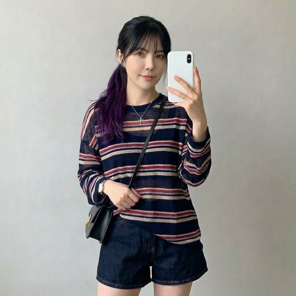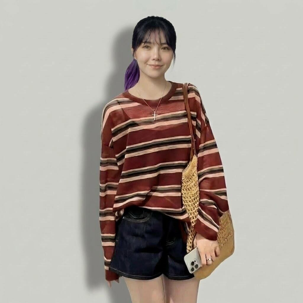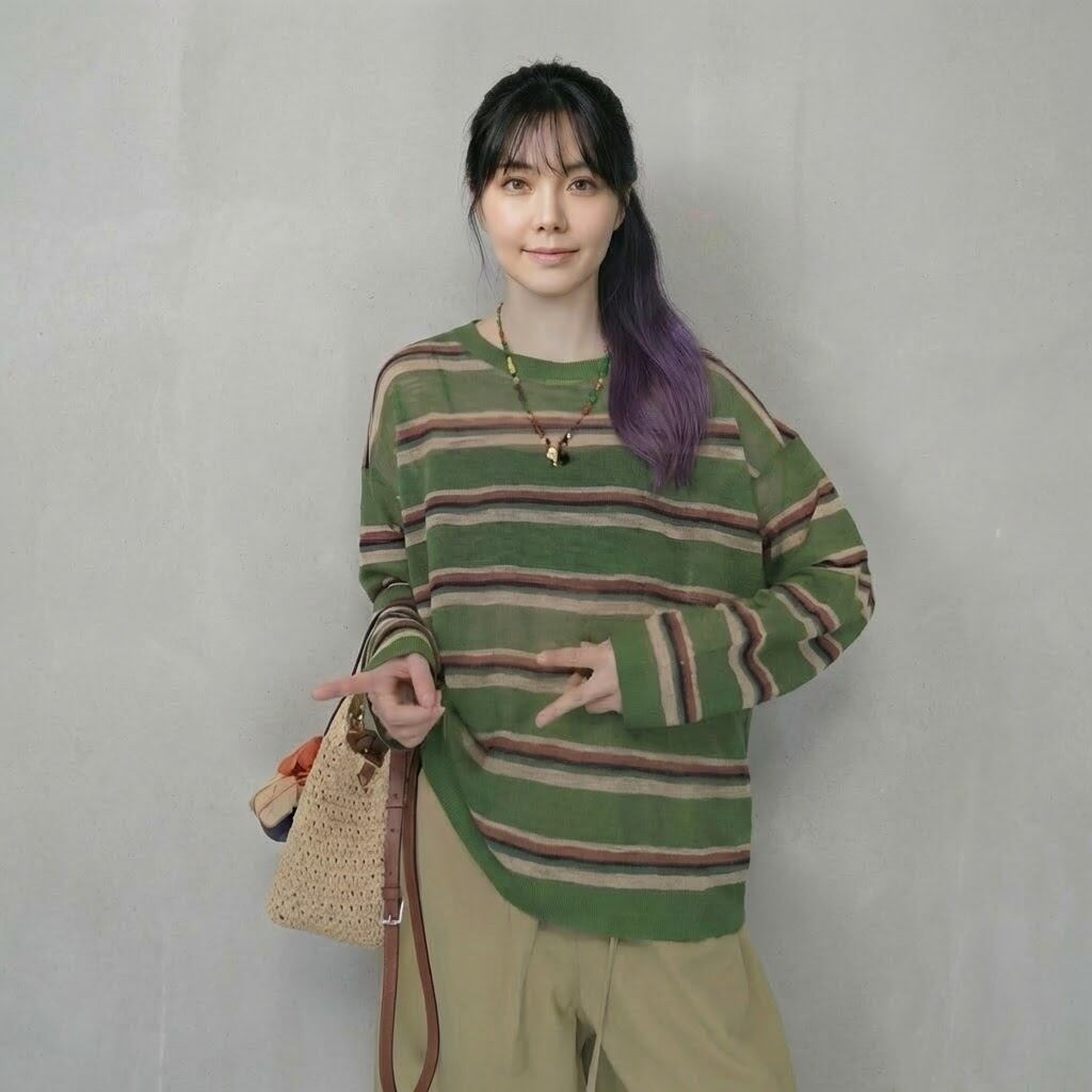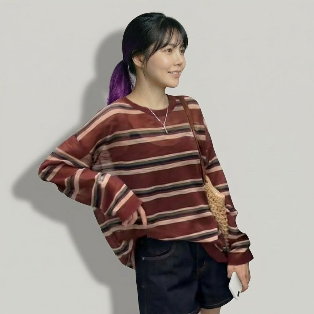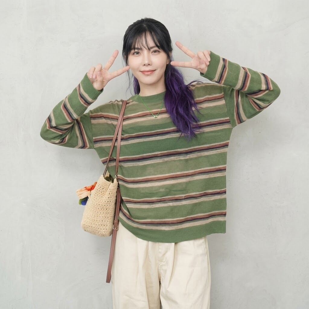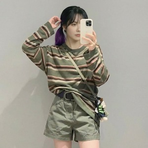 ストライプ柄が印象的な長袖ニットTシャツです。