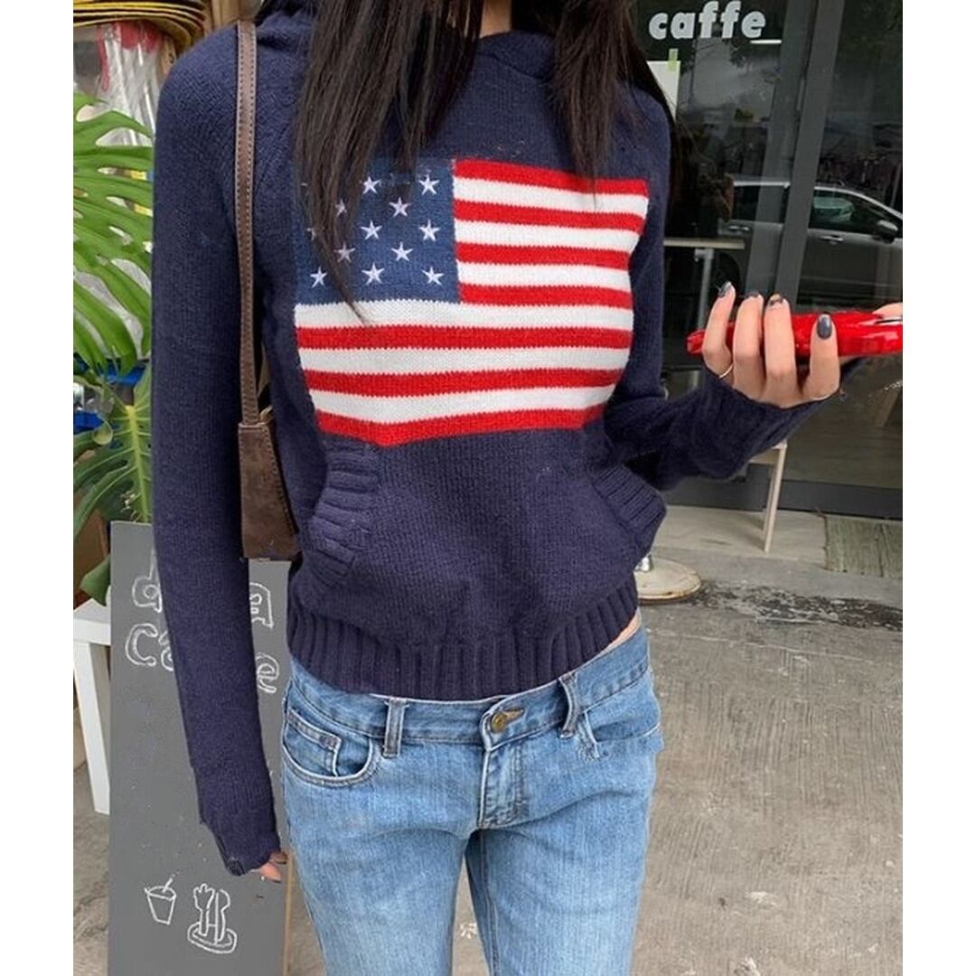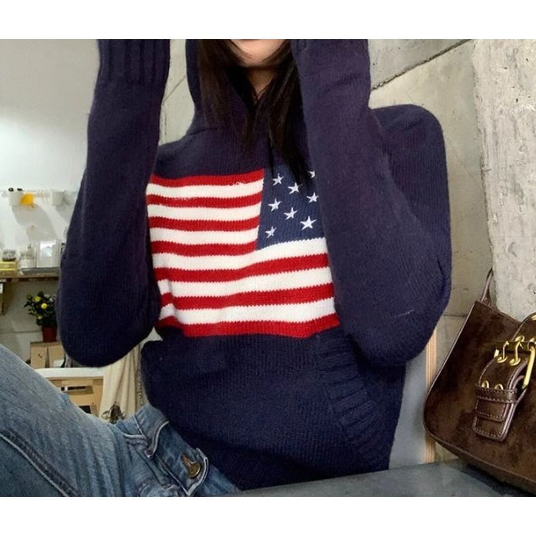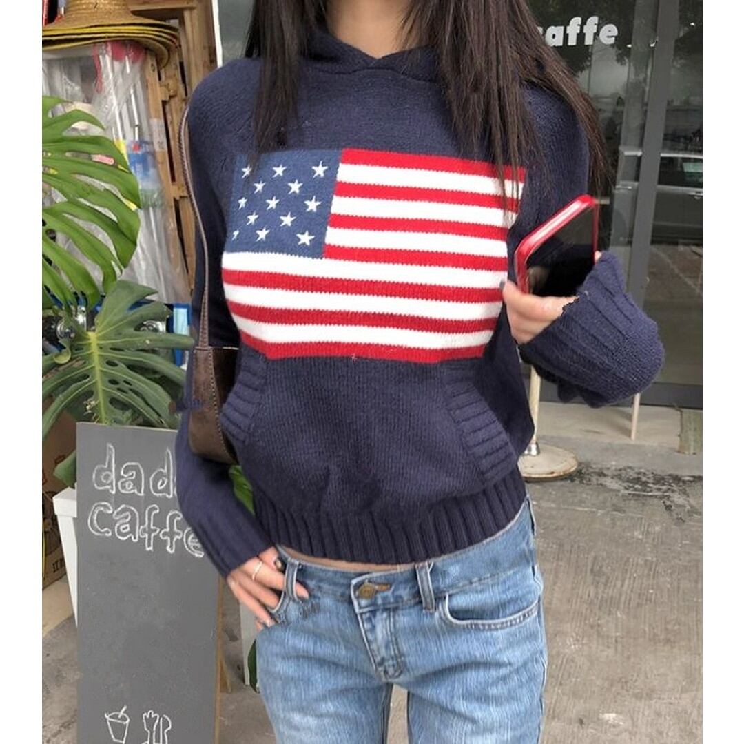 アメリカ国旗柄が印象的なネイビーのフード付きプルオーバーです。